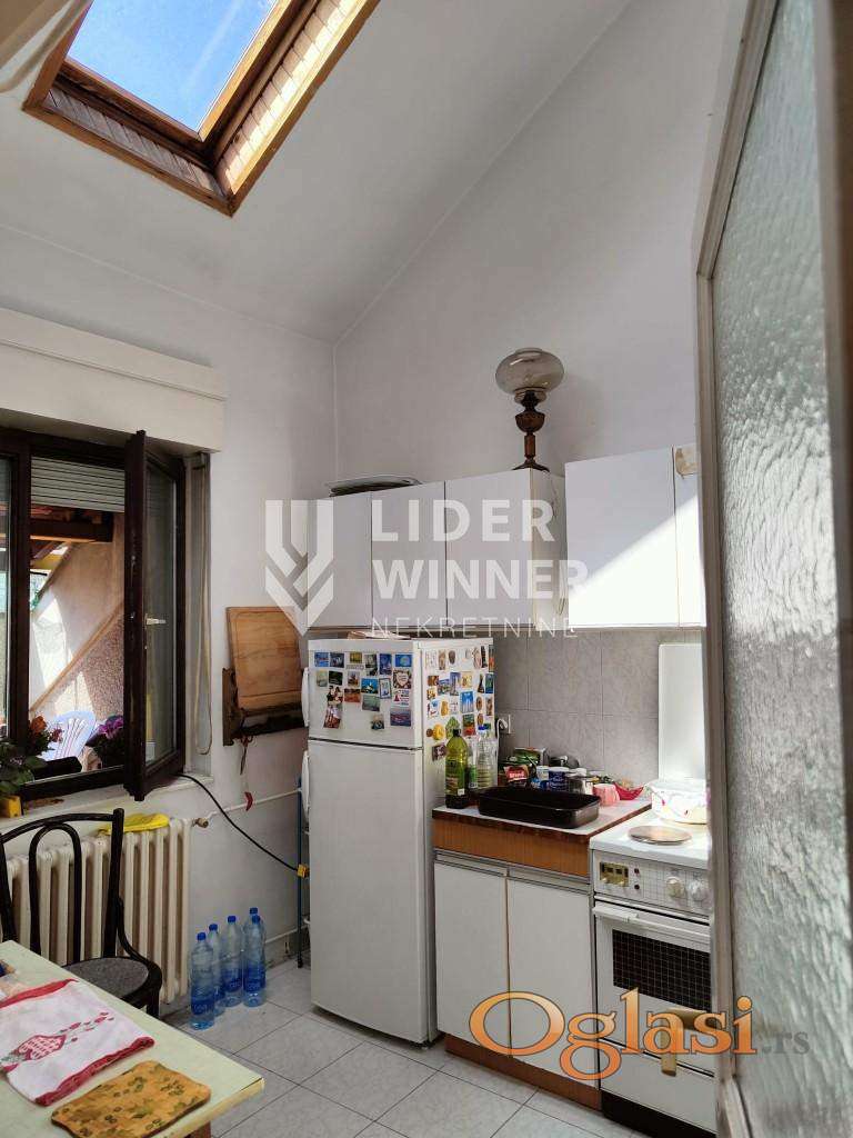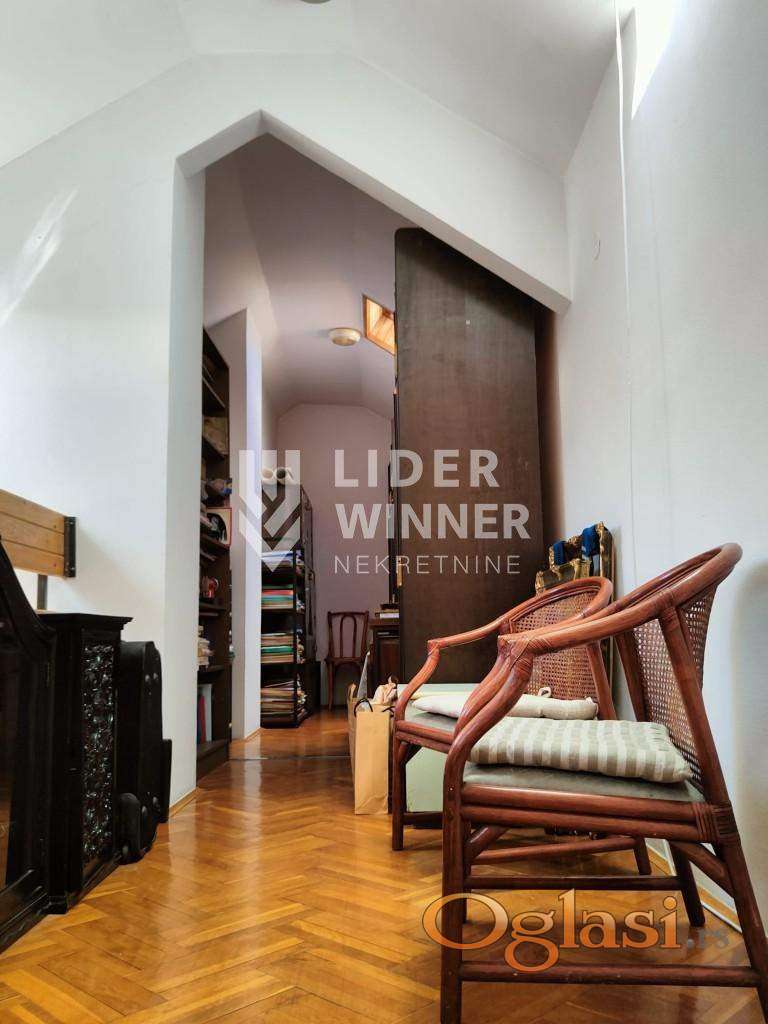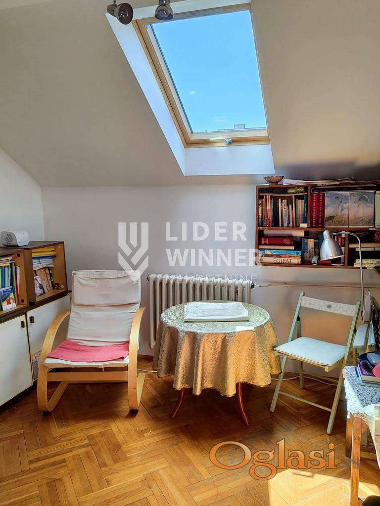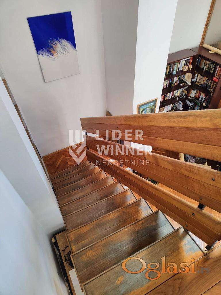 Atraktivan stan u Sokolskoj ulici, izvorno projektovan kao stan atelje. Visna plafona je 5m sa blagim kosinama. U donjem nivou je dnevni boravak, hodnik, kuhinja, kupatilo, 2 spavaće sobe. Na gornjem nivou je galerija od 10m2 + natkrivena terasa. agencijska provizija 2%