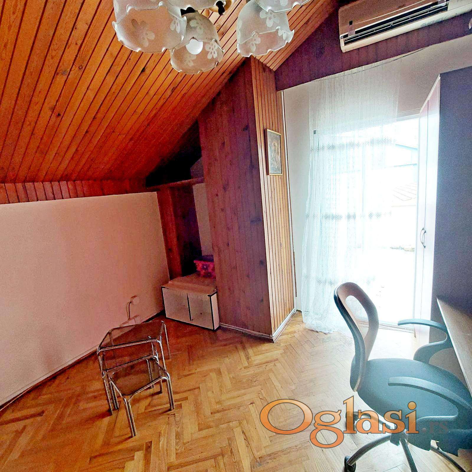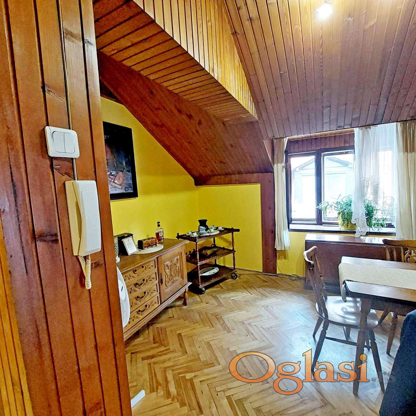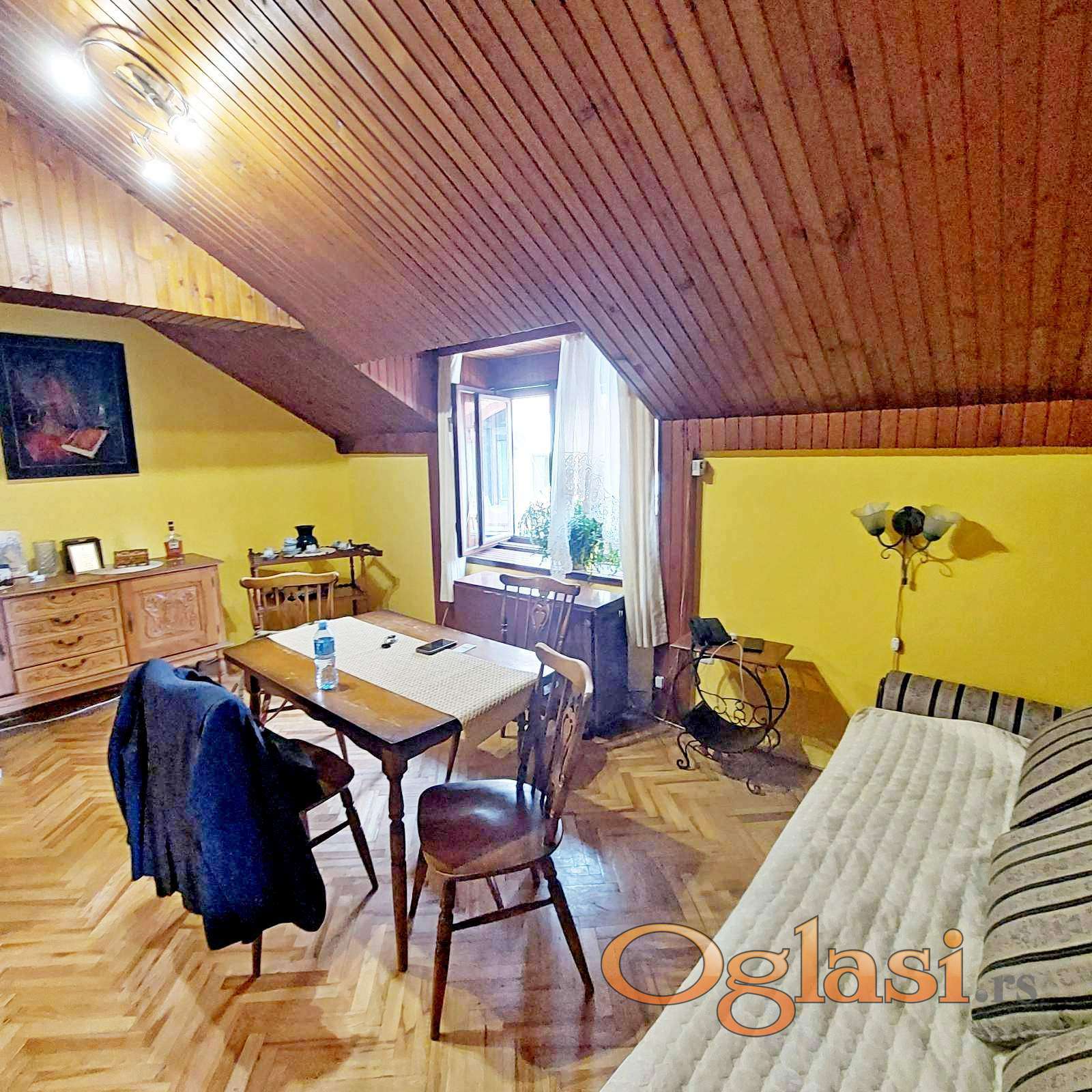 Vračar, Cvetni trg, Njegoševa, četvorosoban, uknjižen, četvorosoban, dupleks od 88m2. Drugi sprat od dva, sa grejanjem na struju -TA. Na prvom nivou su hodnik, kuhinja, trpezarija, dve sobe, kupatilo, ostava i terasa (12m2), a na drugom nivou su dve sobe sa krovnim prozorima. Postoji mogućnost za izgradnju još jednog mokrog čvora. Dvostrano orijentisan. Bez tereta.