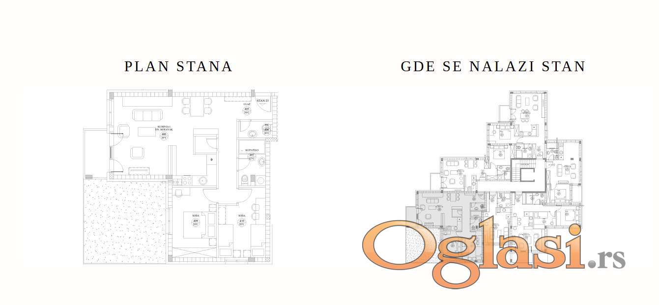 Stan је po strukturi dvosobni, nalazi se na prvom spratu. Sastoji se od ulaza , kuhinje i trpezarije , dnevne sobe , terase , wc-a , kupatila , hodnika , ostave i dve spavaće sobe.
