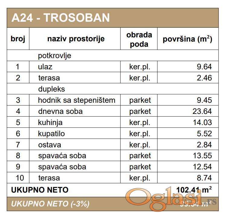 Troiposoban-duplex, komforan stan 99.34m2, na 3.spratu u veoma kvalitetnoj zgradi sa liftom, pouzdanog investitora, na traženojj lokaciji u blizini centra na Podbari. Stan je dvostrano orijentisan, Na 1.etaži poseduje, hodnik, stepenice i terasu, na 2..etaži ima dnevni boravak sa kuhinjom i trpezarijom, tri spavaće sobe, kupatilo, toalet, hodnik, ostavu i terasu,. Grejanje je na gas, sa kalorimetrima. Cena je sa PDV-om. Završetak izgradnje je planiran za kraj oktobra 2025.godine. Za više informacija pozovite 0638854918. - Šifra nekretnine: 1000527