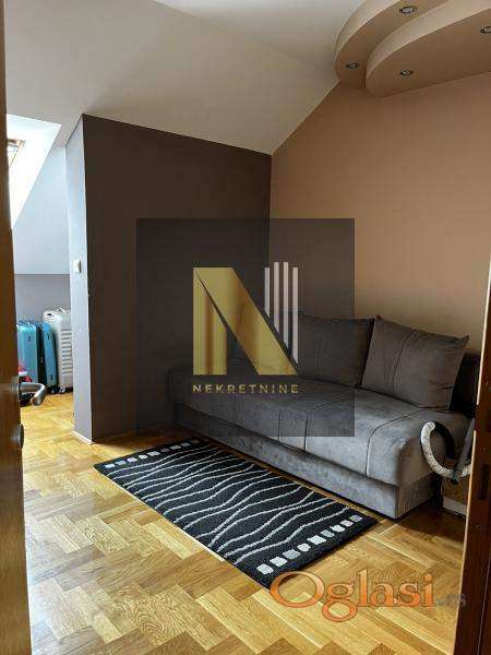 Gornji nivo 3 spavace sobe, kupatilo. Zaseban garderober kompletno opremljen. Odlican parket.