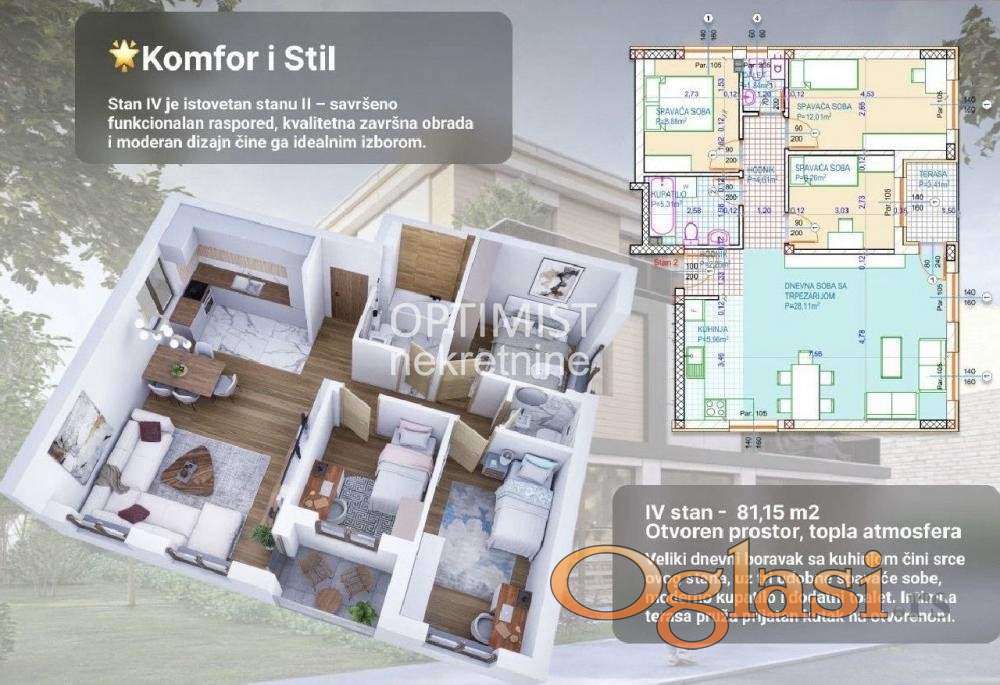 Optimist nekretnine Vam nude na prestižnoj lokaciji, nadomak Keja i starog jezgra Zemuna, savremeno dizajnirane stanove u zgradi visokog standarda i privatnosti. Stan na prvom spratu sadrži tri spavaće sobe, veliki dnevni boravak sa kuhinjom, moderno kupatilo i dodatni toalet. Ekskluzivna zgrada izgrađena najmodernijim i vrhunskim materijalima: Bosalova ulazna vrata, unutrašnja vrata od sofisticiranog farbanog medijapana, podno grejanje na gas, široki traket parket, italijanska keramika i sanitarije, te aluminijumska stolarija sa roletnama na elektro pogon – savršen spoj elegancije i funkcionalnosti. Detalji: - Terasa - Lift iz garaže - Klima - Video nadzor - Podzemna garaža (20.000 € + PDV) - Interfon Rok za završetak radova i useljenja je avgust 2026.godine Cena stanova iznosi 3.250e po 1m2 + PDV. Za kupce prvog stana povat PDV-a. Hvala što ste izdvojili vreme za naš oglas! Agencijska provizija 2%