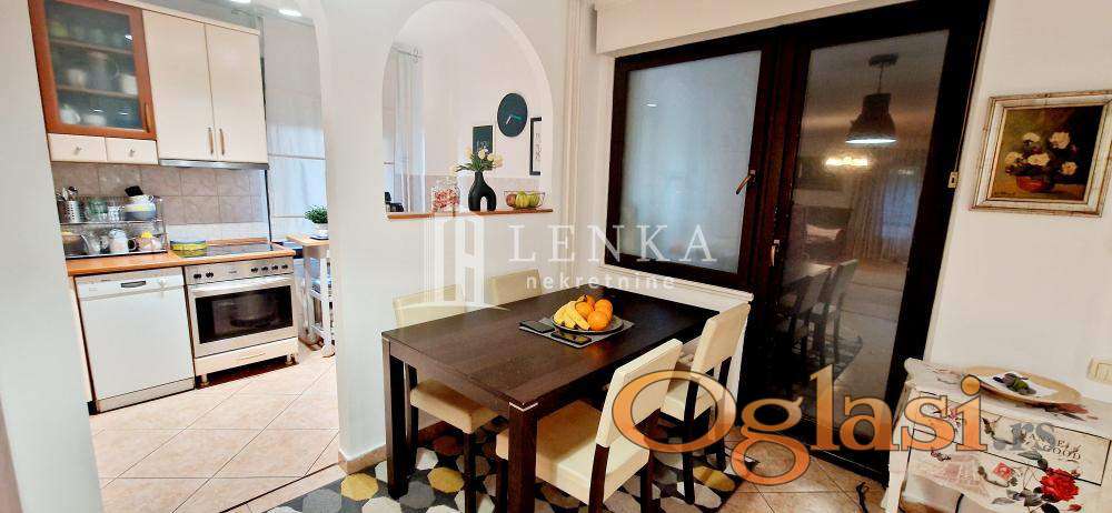 Na samom ulazu u objekat postoji predhonik kao dodatno obezbeđenje samu nekretninu .Na drugoj etaži otvaraju Vam se blindirana ulazna vrata pri ulasku u ovu predivnu nepokretnost . Široki ulazni hodnik vas vodi u prostrani open space upotpunjen dnevnim boravkom koji odiše udobnošću i toplinom, trpezarijrijom gde će te razgovarati sa svojim ukućanima ili gostima, opuštati se i smejeti iz hranu piće koju možete pripremiti u kuhinji (sa svojom ekonomskom lođom) gde je spojena esttetika i funkcionalnost. Iz dnevnog boravka se izlazi na veliku centralnu lođu sa pogledom od XY$. Konfor ovog prostora se vidi i kroz svedeni spavaći blok od tri spavaće sobe od kojih se svaka može koristiti i u druge namene. Toalet i kupatilo sa kadom su izuzetno lepi i odišu funkcionalnošću dobijenom kroz izabrane boje i podržano toplim materijalima tako da deluju opuštajuće. Prostor je opremljen novim modernim ugradnim elementima koji ostaju u stanu. Elektro mreža postavljena za više pozicija u svakoj prostoriji , PVC stolarijom sa roletnama u spavaćem bloku, Keramika, slavine i sanitarije su visoke klase a na podovima je kvalitetnim hrastov parket. Na istom spratu se i nalazi ostava koju koriste vlasnici ovog sjanog stana.Uz stan se prodaje (po ceni od 25000 evra) garaža gde možete da parkirate svog četvorotočkaša. Kupac plaća proviziju 2%.