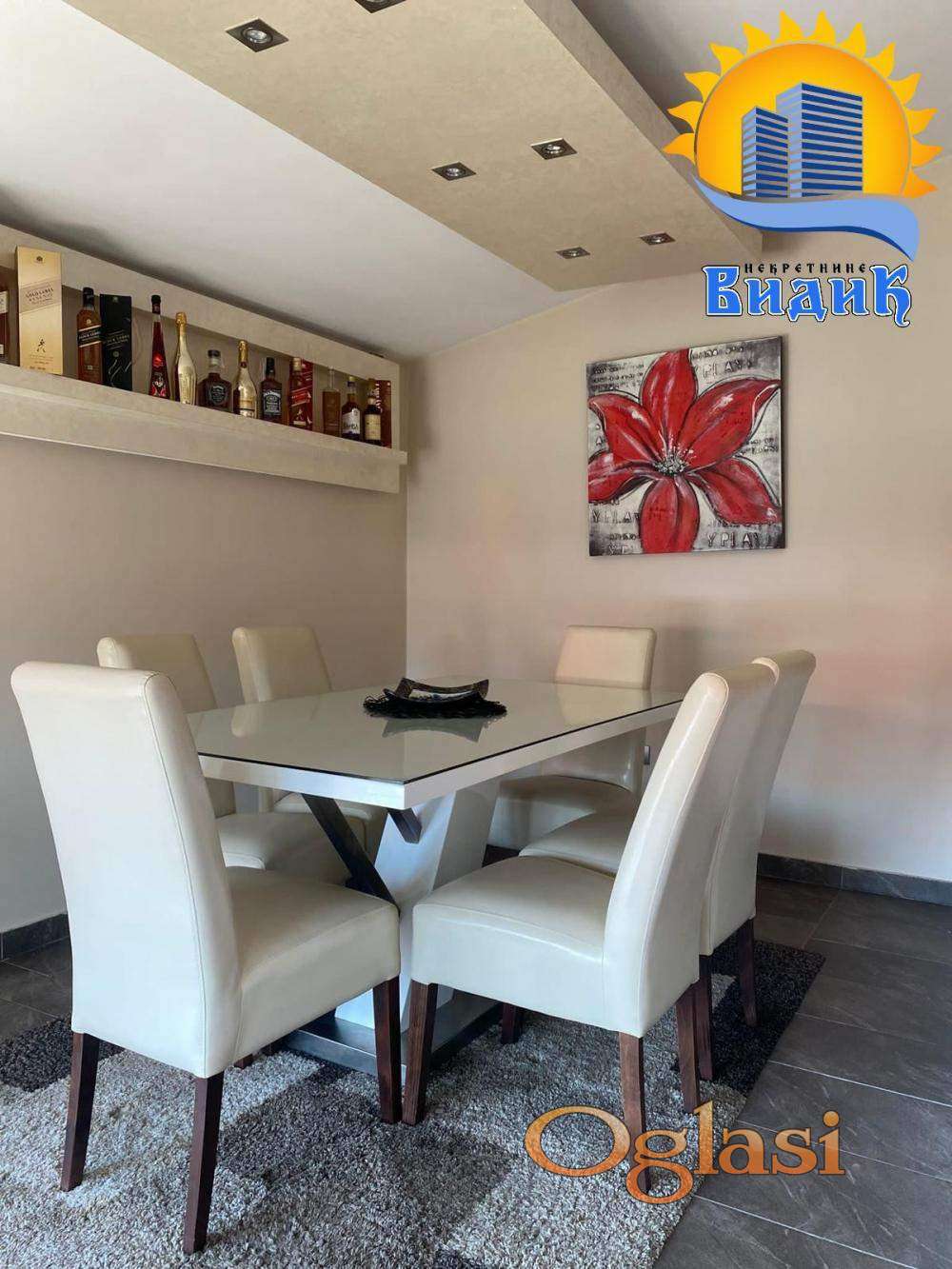 Sastoji se: hodnik, gostinski toalet, dnevni boravak sa izlaskom na prelepu terasu, kuhinja sa trpezarijom od kvalitetnih materijala i novom belom tehnikom, velike spavaće sobe sa svojim kupatilom, druge dve sobe sa izlaskom na terasu i veliko kupatilo.