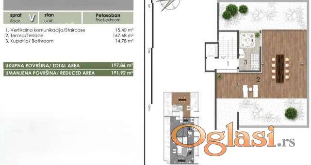 Stan je uknjižen na 127,20m2 +200m2 terasa, sa prelepim pogledom na reku Dunav i Frušku goru.