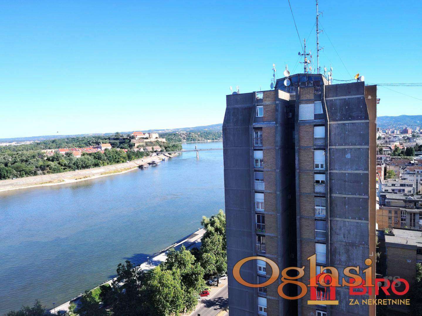 Visoka spratnost i dobra pozicija pružaju fenomenalan pogled na mostove i Petrovaradinsku tvrđavu. U pitanju nije poslednja etaža. Stan je dvostrano orijentisan. Ova nekretnina se sastoji iz dnevnog boravka, kuhinje sa trpezarijom, dve spavaće (svaka poseduje sopstveni francuski balkon), kupatila, toaleta i velike zatvorene terase (PVC stolarija) koja pruža pogled o kom je izlišno i pričati.