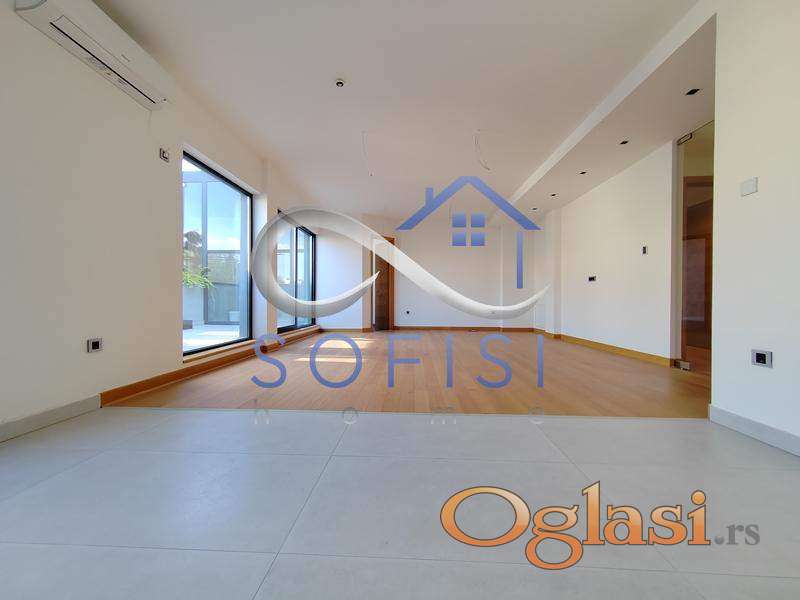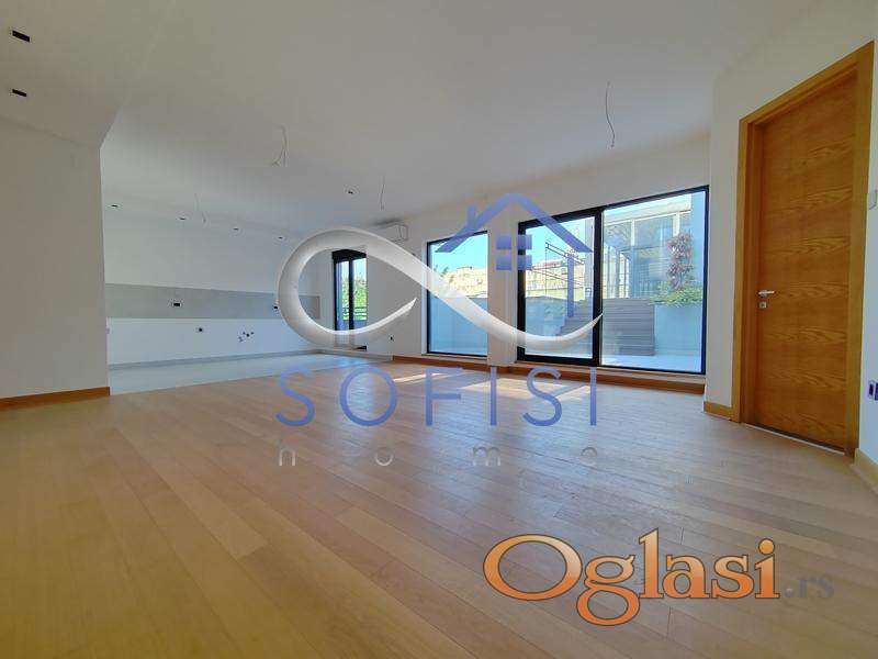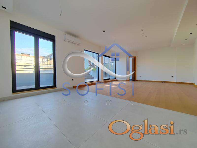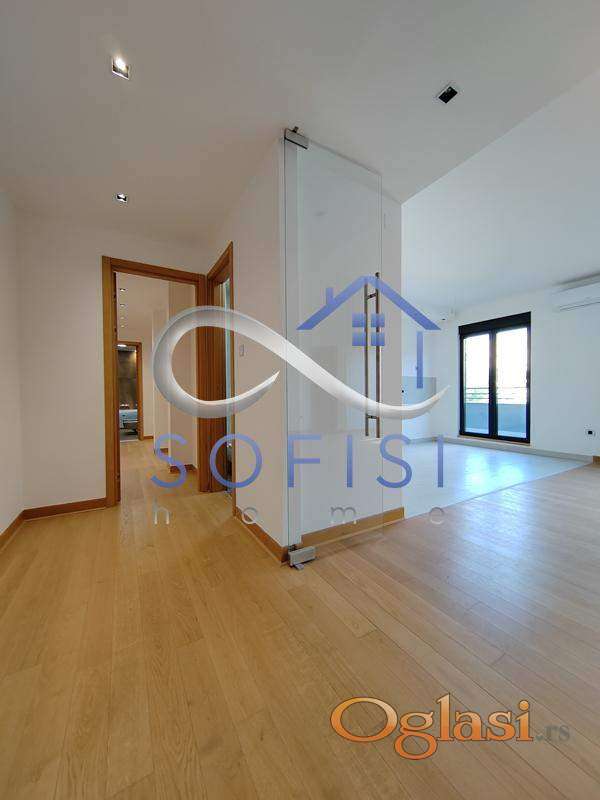 Novi Sad, Adamovićevo naselje. Direktno od investitora. Luksuzan četvorosoban stan najsavremenijeg dizajna, sa sopstvenim bazenom. Nadomak osnovne i srednje škole, a u neporednoj blizini Bulevara cara Lazara i Bulevara Evrope. Ovaj veoma svetao stambeni prostor pored luksuzne note i izuzetnog komfora odlikuje i funkcionalan raspored prostorija - u sve prostorije se ulazi iz dugačkog hodnika, a u sam stan se pristupa direktno iz lifta. Prostran i osvetljen dnevni boravak sa trpezarijom i velikom kuhinjom, tri spavaće sobe, kupatilo sa ležečom kadom, toalet posebno, jedna terasa i krovna terasa sa bazenom koja zauzima 120m2 ovog prelepog stana. Velika pažnja posvećena je energetskoj efikasnosti objekta. Objekat poseduje "Energetski pasoš" gde je ostvaren energetski razred objekta "B" kategorije. Spoljni zidovi sastoje se od termobloka i kontaktnog toplotno izolacionog sistema koji ima najmanje karakteristike reakcije na požar B-s2,d1 ili toplotno izolacionog sloja i "Fundermax" ploča sa uključenim ventilisanim slojem gde izolacioni materijal ima najmanje klasu reakcije na požar. Fasadni otvori na stanovima su zatvoreni visoko kvalitetnom stolarijom i zastakljeni niskoemisionim višeslojnim termoizolacionim staklom sa ispunom od Argona. Ulazna vrata su sigurnosna (hrastov furnir). Sobna vrata su takođe visokog kvaliteta, nestandardne visine u skladu sa "salonskom" spratnom visinom (svetla visina 2,95m). Kupatila su opremljena sanitarnom opremom renomiranih proizvođača kao što su "Villeroy & Boch", i "Hansgrohe" (konzolne wc šolje i ugradni vodokotlići "Geberit"). Gasna kotlarnica smeštena je u prizemlju objekta gde će se vrši i centralna priprema sanitarne tople vode za ceo objekat (nisu potrebni bojleri u stanovima). Za svaki stan predviđen je kalorimetar sa nezavisnim merenjem, svi stanovi i prostorije u objektu zagrevaju se preko sistema podnog grejanja. U stanovima se predviđa modularna elektro galanterija visokog kvaliteta i tehnička priprema za ugradnju tzv. "pametne kuće". Svaki stan opremljen je video interfonom kao i multimedijalnom kutijom u koju je dovedena optička nit oba operatera (SBB i Telekom). Stanovi su opremljeni split i multi-split sistemom klimatizacije. Sistem centralnog usisavanja. Za kupce prve nekretnine moguć povrat pdv-a. Useljiv odmah.