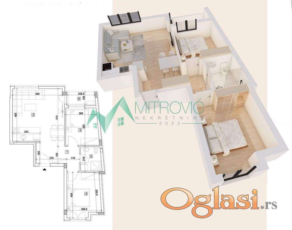 Prodaje se dvoiposoban stan u izgradnji na odličnoj lokaciji. .Stan se nalazi na I spratu. Sastoji se od dnevne sobe sa kuhinjom i trpezarijskim delom, dve spavaće sobe, kupatila i terase. U oglašenu cenu uračunata je posrednička naknada u iznosu od 3%. Kontakt: 069/383-1005.