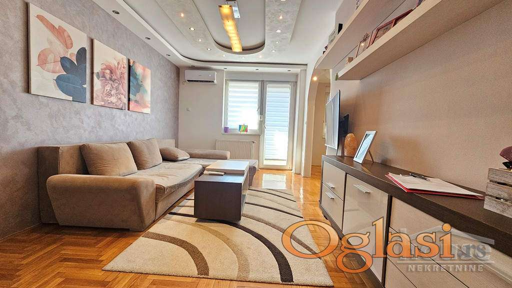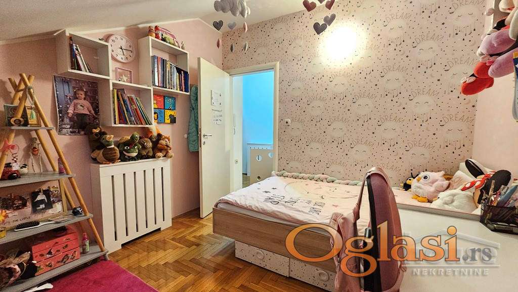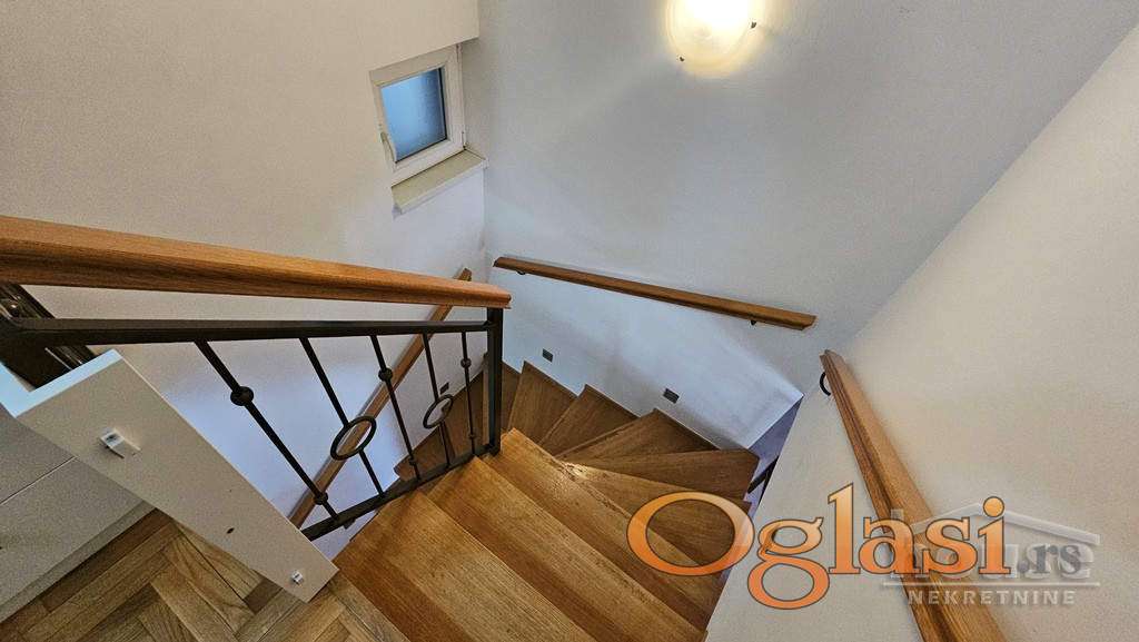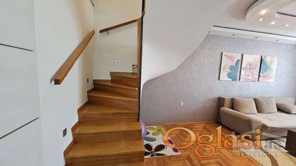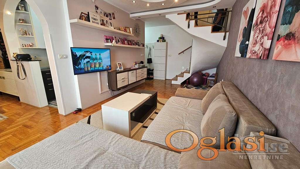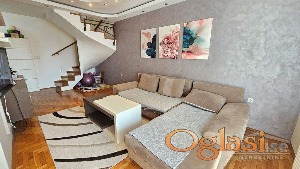 Agencijska oznaka: 1064097 CENA: 205.000 e + agencijska provizija od 3%. Prelep trosoban dupleks, kompletno namešten. Na prodaju izuzetno funkcionalan i svetao trosoban dupleks koji se nalazi u mirnom i prijatnom okruženju – idealan za porodični život. Na donjoj etaži, nalazi se prostrana dnevna soba, odvojena kuhinja sa trpezarijom, toalet i terasa a na gornjoj etaži su dve komforne spavaće sobe i kupatilo. Stan je opremljen PVC stolarijom, kvalitetim parketom,  modernom i očuvanom keramikom a ulazna vrata su sigurnosna. Postoji mogućnost kupovine garaže uz stan. Za dodatne informacije pozvati: 065 51 880 45 Višnja Tomić