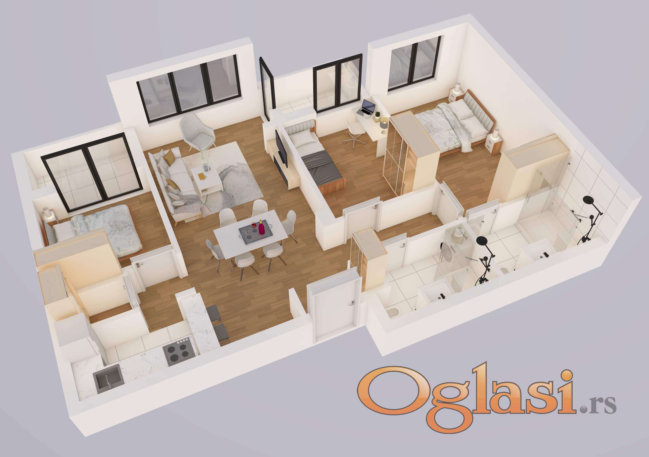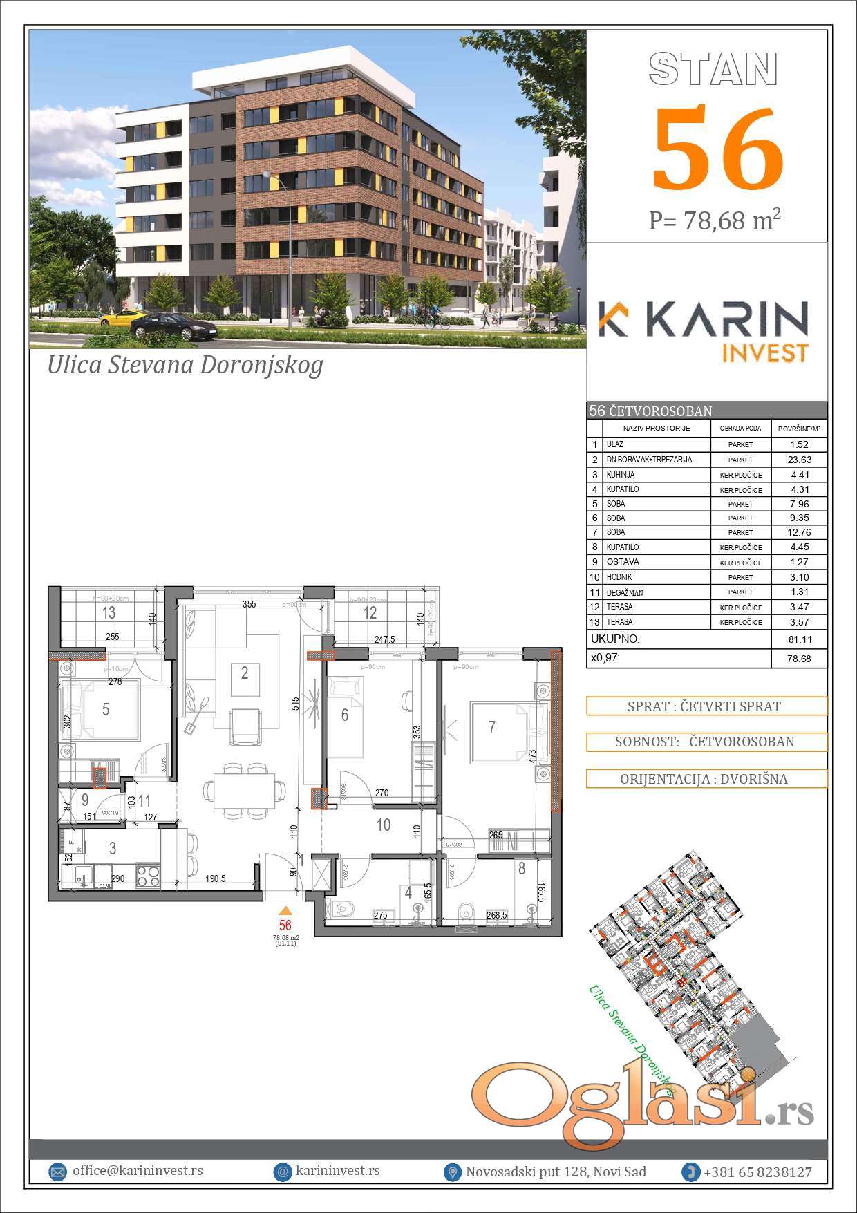 Prodaje se odličan četvorosoban stan broj 56 na četvrtom spratu dvorišno orjentisan projektovane površine 78,68m2 . Stan odličnog rasporeda . Sastoji se od klimatizovanog dnevnog boravka sa izlazom na terasu, dve spavaće sobe, master sobom sa kupatilom, kuhinja sa ostavom, kupatilom, dve terase.