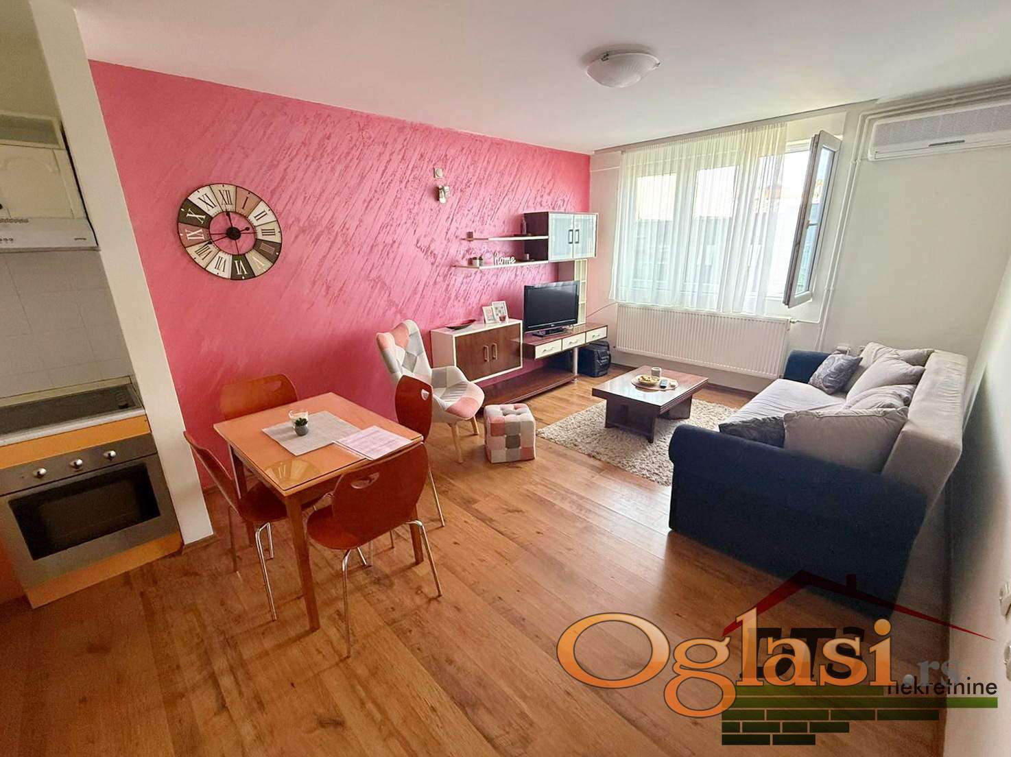 Stan u samom centru grada, po strukturi 1.5 soban, dnevna soba sa kuhinjom i trpezarijom, odvojena spavaca soba, na 5. sprat od 6 spratova, 43m2, grejanje je CG, novije gradnje bez lifta. Kompletno opremljen stan, prodaje se sa stvarima kao na slici. Odlicna lokacija stana u samom srcu grada u neposrednoj blizini Kalce i setalista.