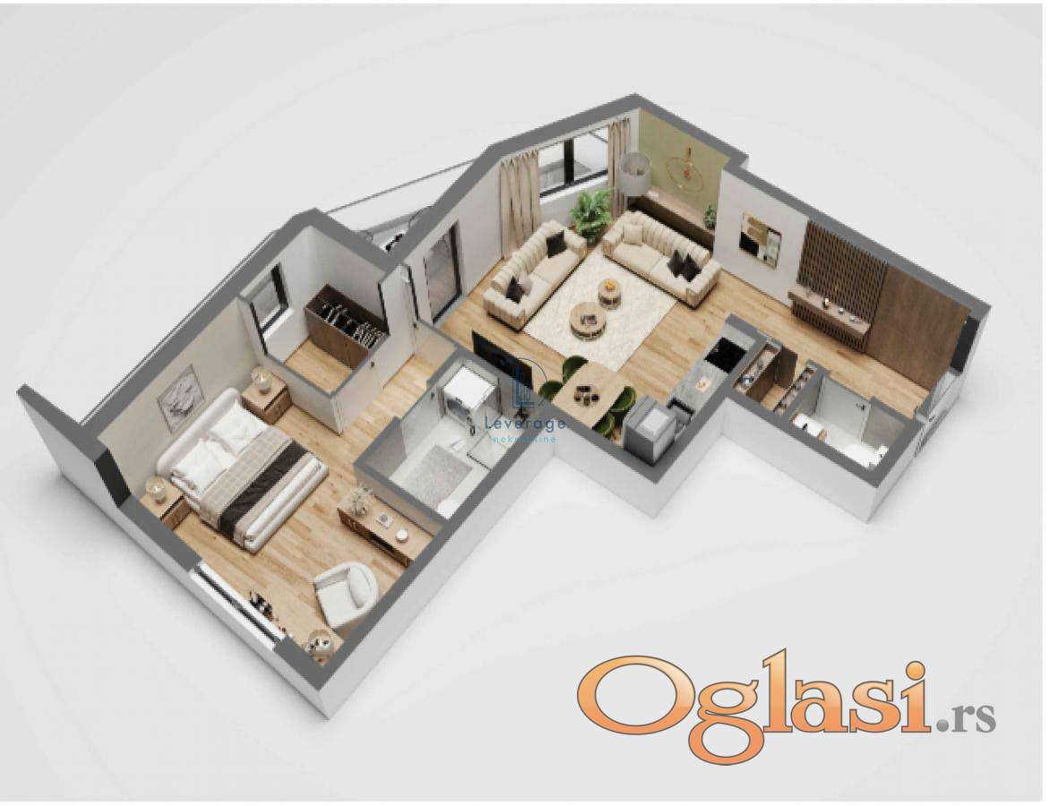 Stan je funkcionalno organizovan i sastoji se od ulaznog hodnika, kombinovane dnevne i spavaće sobe, spavaće sobe, toaleta, ostave,, kupatila, deganžmana i terase – što ga čini pogodnim kako za pojedince i parove, tako i za manje porodice.