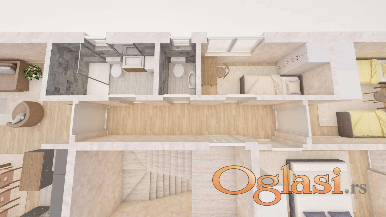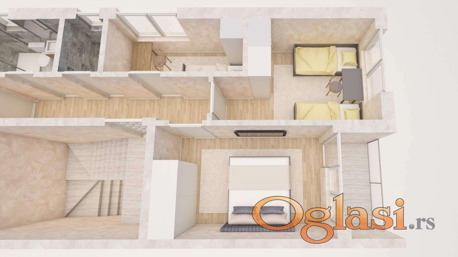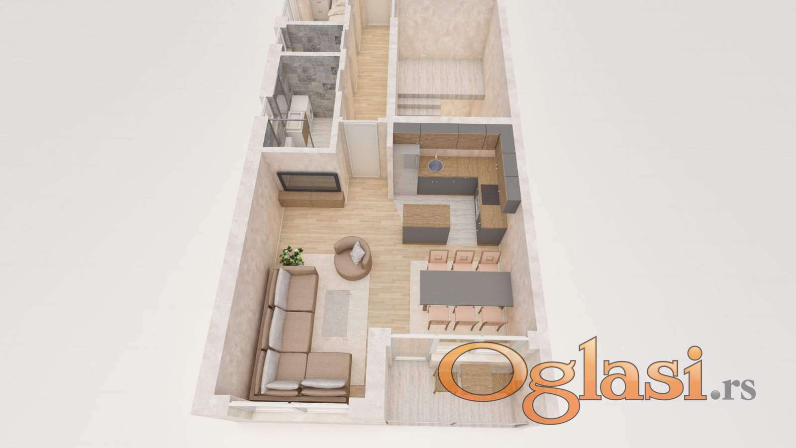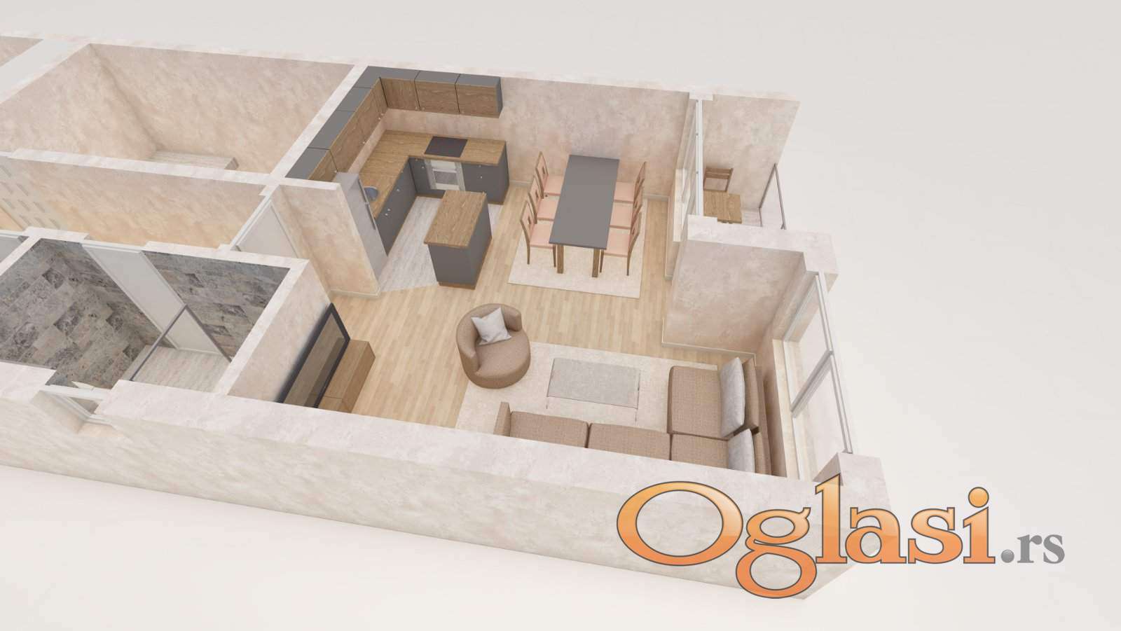 Struktura stana:hodnik,dnevna soba sa kuhinjom,dve spavaće sobe,kupatilo,toalet,dve terase.