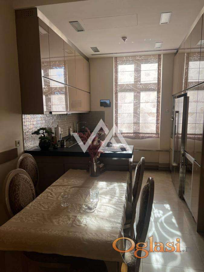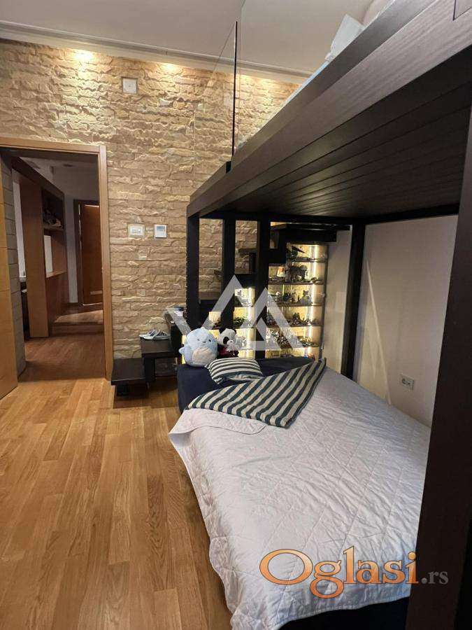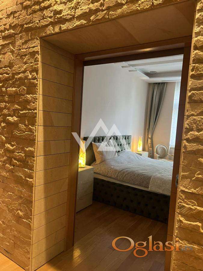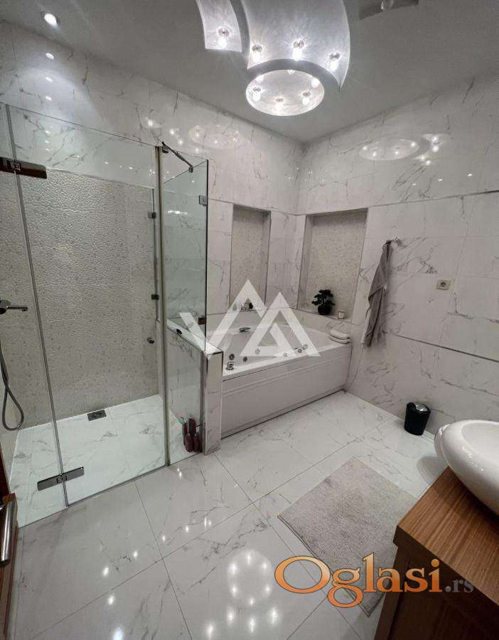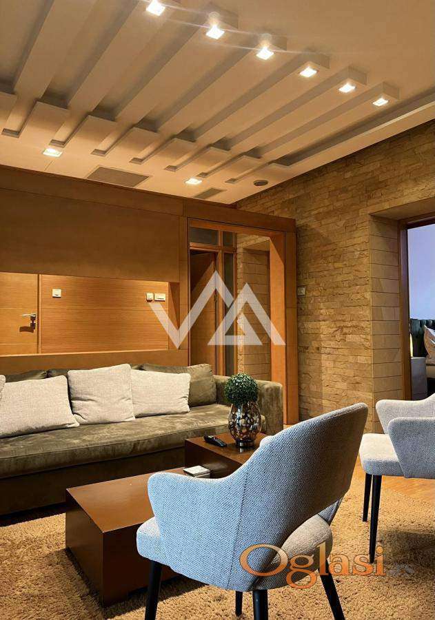Opremljen je vrhunskim materijalima: puni drveni podovi, prirodni dekorativni kamen, moderni plafonski paneli i sofisticirano indirektno osvetljenje.