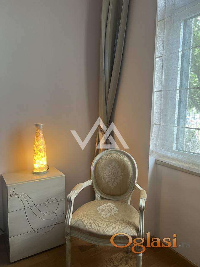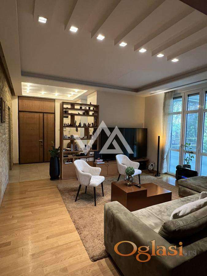 Na prodaju elegantan salonski stan od 116 m², u prestižnoj i mirnoj ulici u centru Zemuna. Smešten u visokom prizemlju reprezentativne zgrade sa renoviranim ulazom, stan nudi raskošan dnevni boravak, dve spavaće sobe, radnu/dečiju sobu, dve kupatilske jedinice (glavno sa đakuzijem), kuhinju sa trpezarijom, garderober, vešernicu i staklenu baštu s izlazom u vrt. Pripada mu i velika uređena podrumska prostorija.