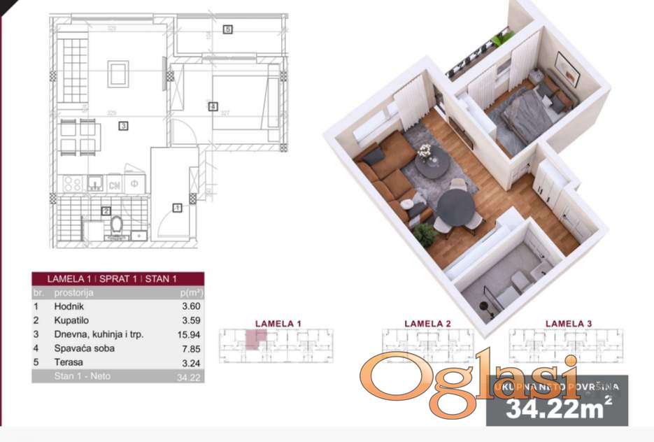 Struktura stana:hodnik,dnevna soba sa kuhinjom,spavaća soba i terasa.