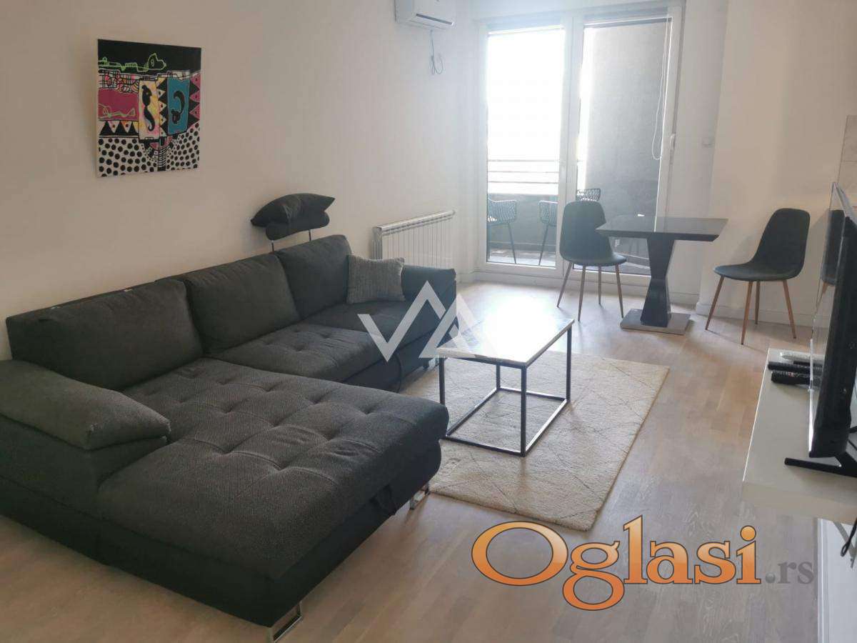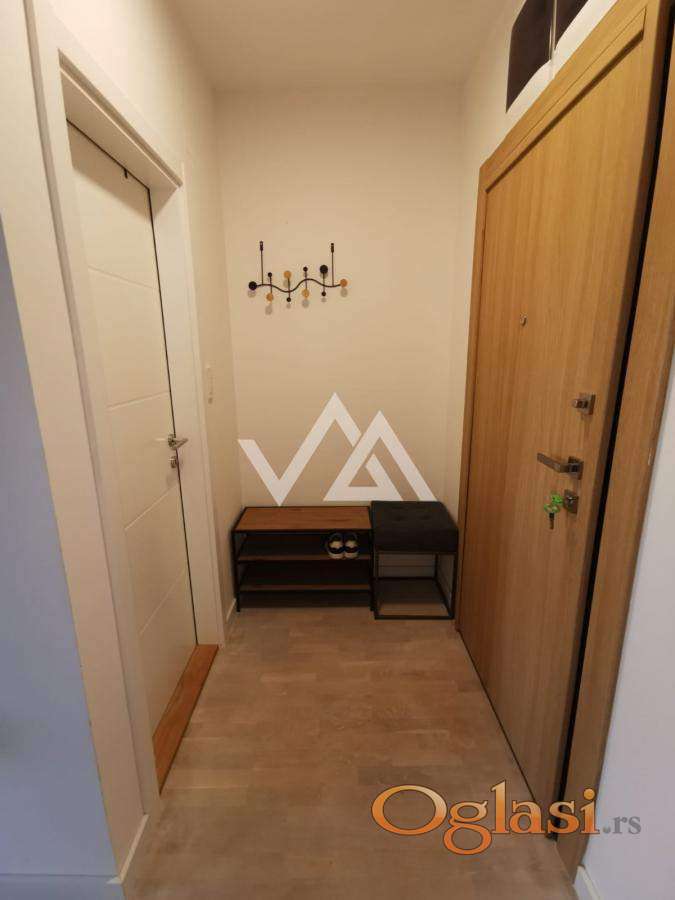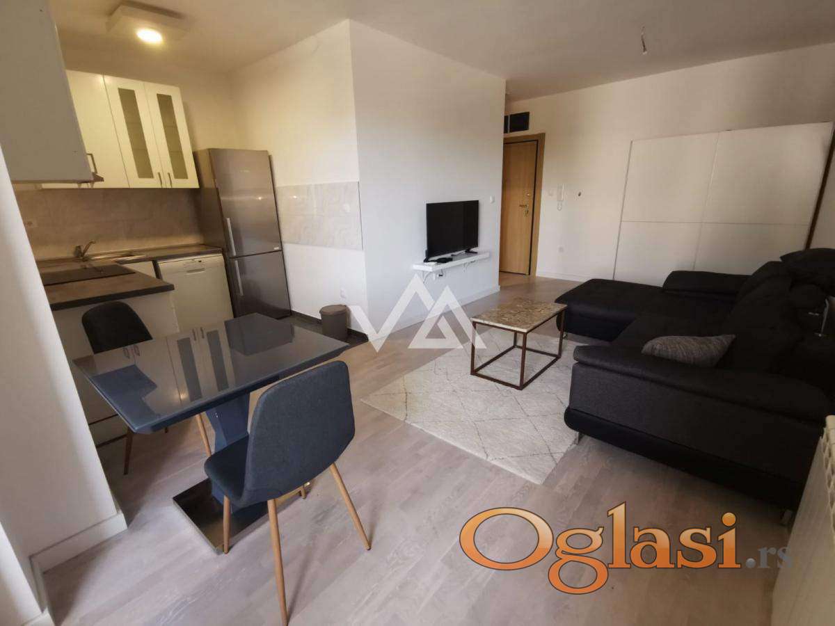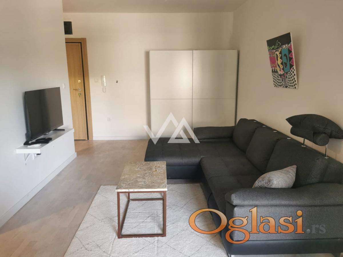 Na prodaju potpuno namešten jednosoban stan u novogradnji, na drugom spratu moderne zgrade savremenog dizajna.