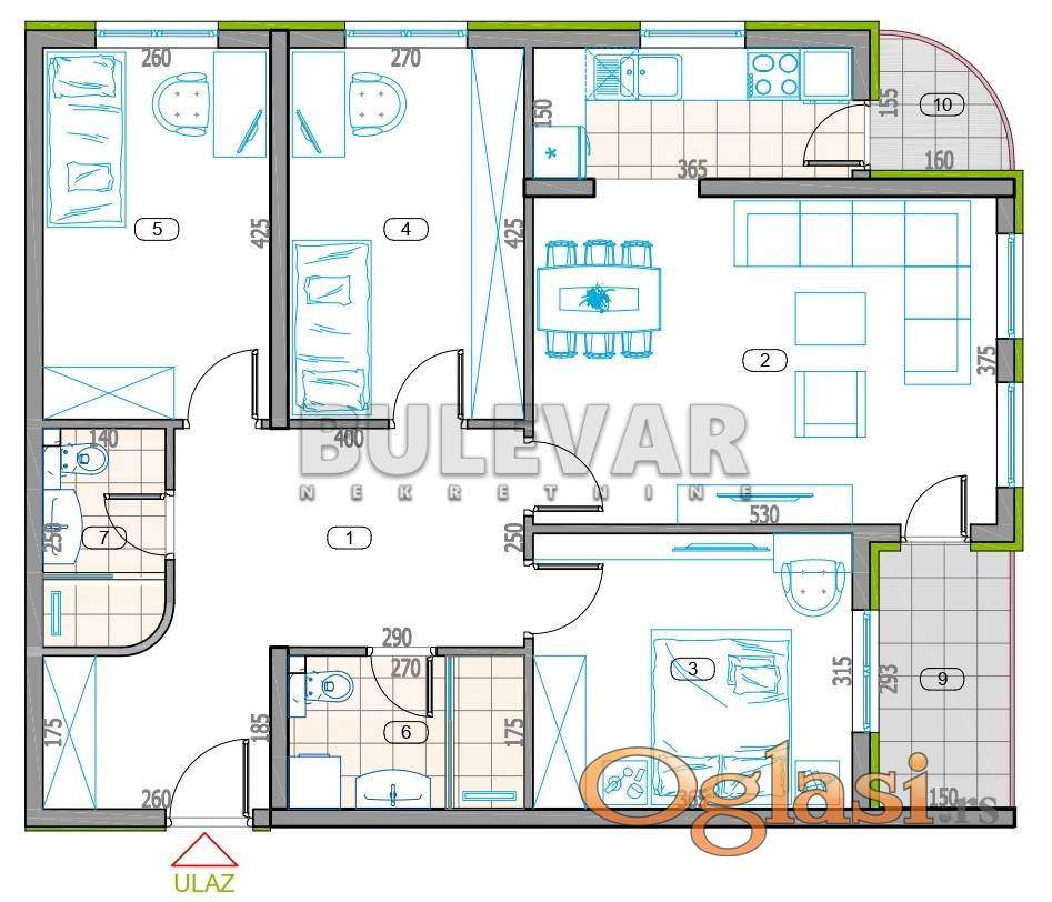 Sastoji se od ulaznog hodnika, dnevnog boravka sa trpezarijom, izdvojene kuhinje, tri spavaće sobe, dva kupatila i dve terase.