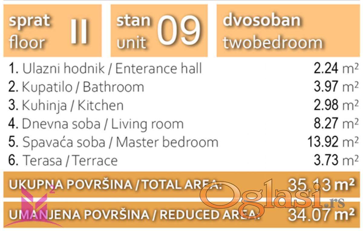 Sastoji se od dnevne sobe koja je spojena sa kuhinjom, spavaće sobe, kupatila i terase.
