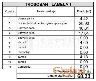 Stan ima 68,33m2 projektovane površine, po strukturi je trosoban.