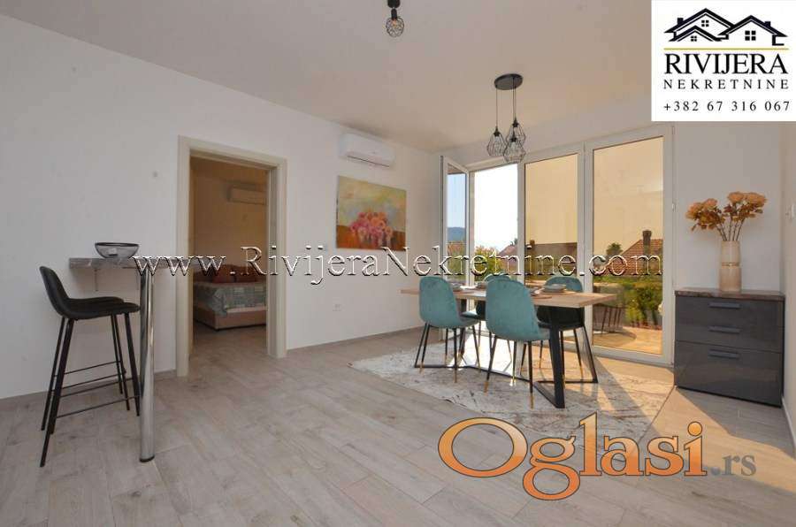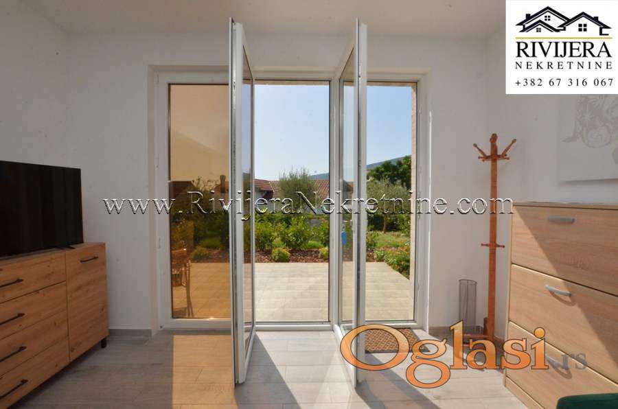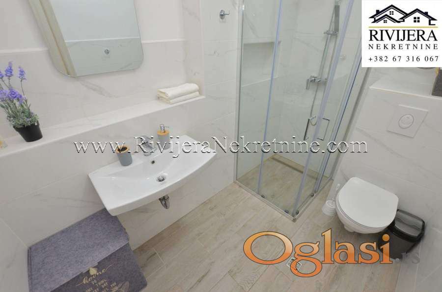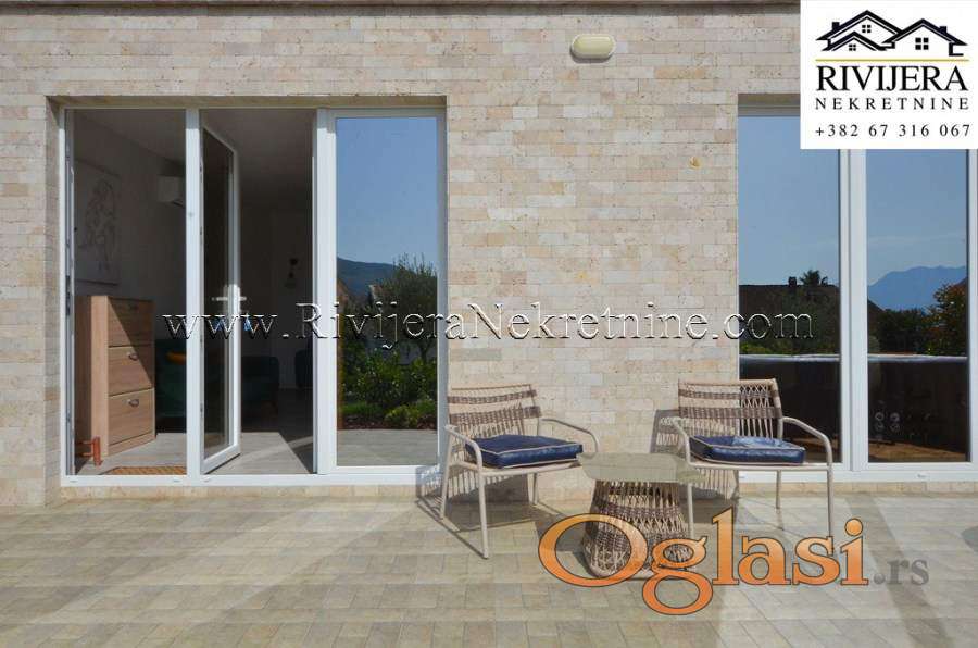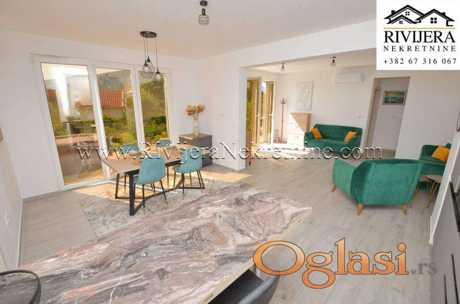 Dvosoban stan sa dvoristem na obali mora Djenovic. Stan kompletno opremljen juzno orjentisan u odlicnom stanju. Povrsina stana 77 m2 + 100 m2 dvorista + ostava 5 m2 + parking.