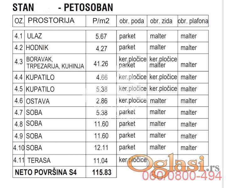 5.0, 115.53m2(terasa 11.04m2), lift, PS/2 , telefon, interfon. Građevinska dozvola.