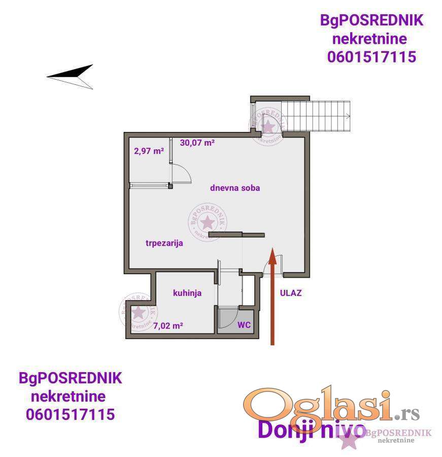 Donji nivo : dnevni prostor- trpezarija, kuhinja, wc, lođa.