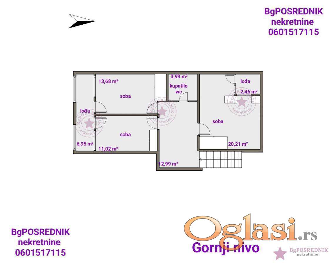 Gornji nivo : tri velike spavaće sobe, kupatilo sa wc-om, dve lođe