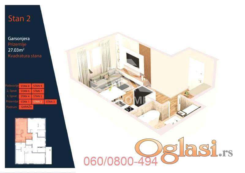 0.5, 27.03m2,bašta 50m2, toplotne pumpe, lift, PR/IV, telefon, interfon. Građevinska dozvola.