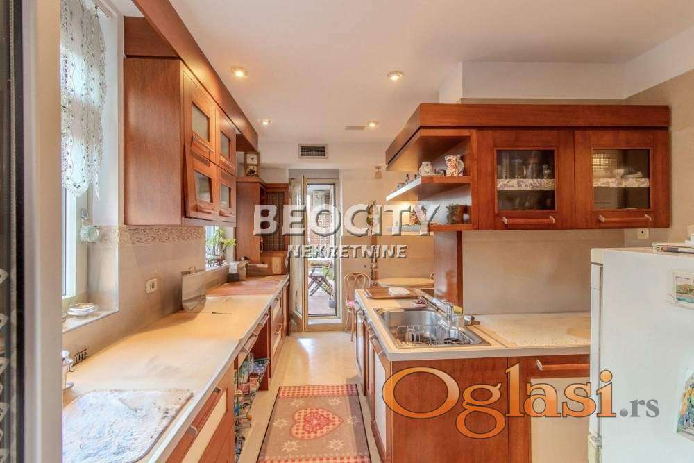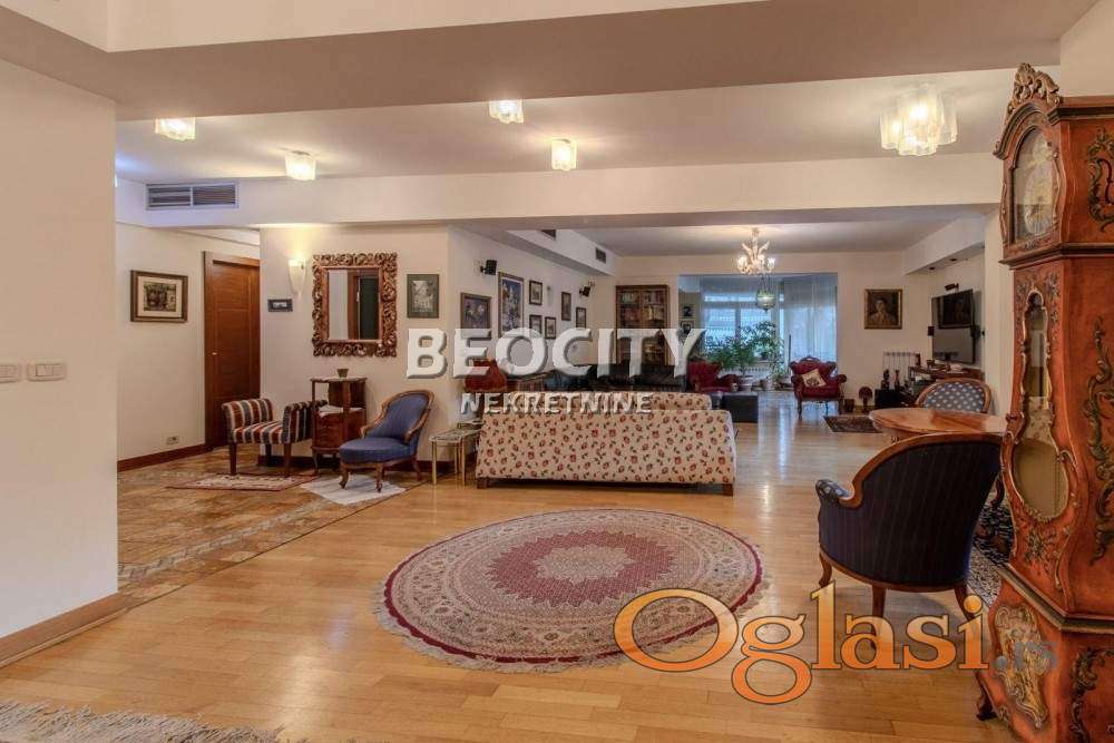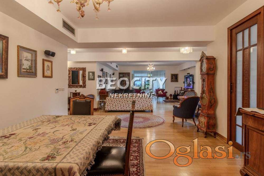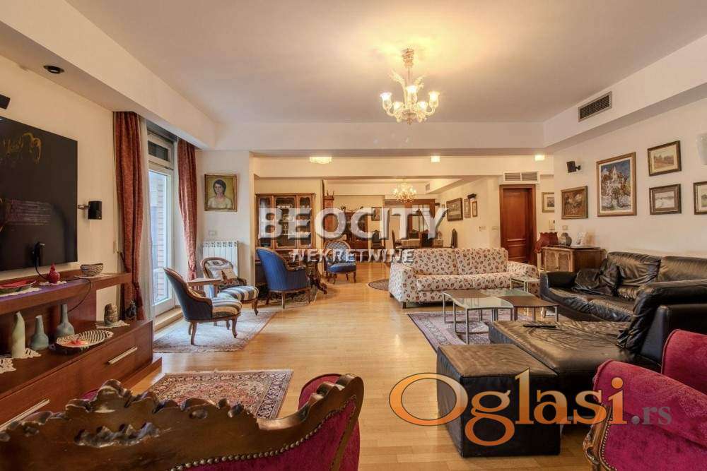 Agencijski ID: 123527, III/V, lift, terasa(3), uknjižen, garaza, stambena zgrada. Otmen i udoban porodičan stan, po strukturi 4.0, uknjižen na 250m2, opremljen po najvišim standardima sa duhom elegancije, u prestižnom delu Vračara. Smešten je na III spratu stambenog objekta visokog kvaliteta novije gradnje. Pravo uživanje za one koji vole udobnost sa luksuzom i tehnologijom današnjice. Prestižni enterijer projektovan je i osmišljen do najsitnijih detalja. Veći deo stana gleda suprotno od ulice, tako da odiše mirom, tišinom i osećajem privatnosti. U dnevnom delu se nalazi veoma prostrana dnevna soba od 100m2 sa izlazom na veliku terasu, zasebna kompletno opremljena kuhinja, tri kupatila, tri spavaće sobe od kojih je jedna studio sa sopstvenim kupatilom, walk-in garderober, prijemna garderoba, ostava/špajz, vešernica. Visina plafona 2.75m. Poseban kutak za uživanje je čarobna terasa od 22m2, kao i još 2 terase od po 8m2, sve dvorišno orijentisane. Ovaj čaroban stan je u odličnom stanju, očuvan i uredno održavan, tako da nisu potrebna dodatna ulaganja. Spoljašnja aluminijum-drvo stolarija, unutrašnja skupocena stolarija, centralno grejanje sa kalorimetrima (po potrošnji), podno grejanje u velikom kupatilu i na dva mesta u stanu ispod travertina, centralna klima. Stan se prodaje sa kuhinjom i ugradnim elementima. Mogućnost kupovine jednog garažnog mesta, uz doplatu od 50.000e. Savršen izbor za porodičan život ili poslovni prostor u srcu Vračara. Prvi vlasnik, uknjižen, bez tereta. Više informacija na: www.beocitynekretnine.rs Agencijska provizija 2%. Telefoni: 060/328-3901 • 060/555-9720 • 011/328-3901. Kontakt van radnog vremena: kancelarija@beocitynekretnine.rs