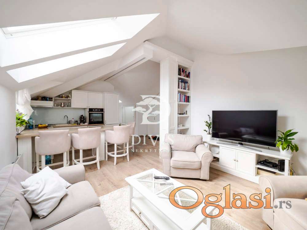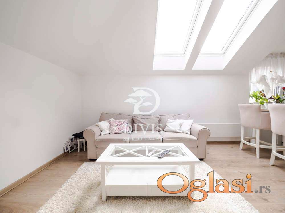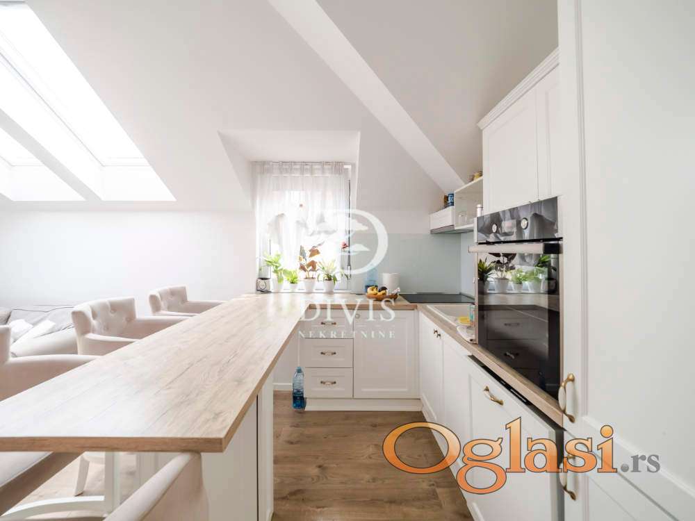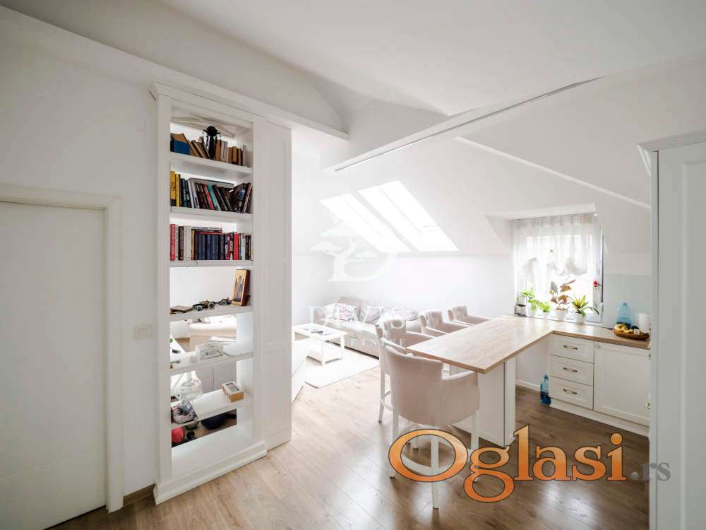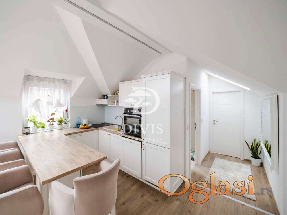 Stan se sastoji od ulaznog dela, kuhinje sa trpezarijom, dnevne sobe, kupatila i dve spavaće sobe. Stan je kompletno renoviran pre dve godine, sa potpuno novom krovnom konstrukcijom. Stan se prodaje sa ugradnom kuhinjom i svim ugradnim elementima u stanu, koji su rađeni po meri.