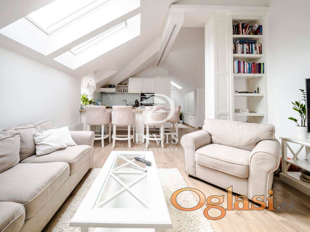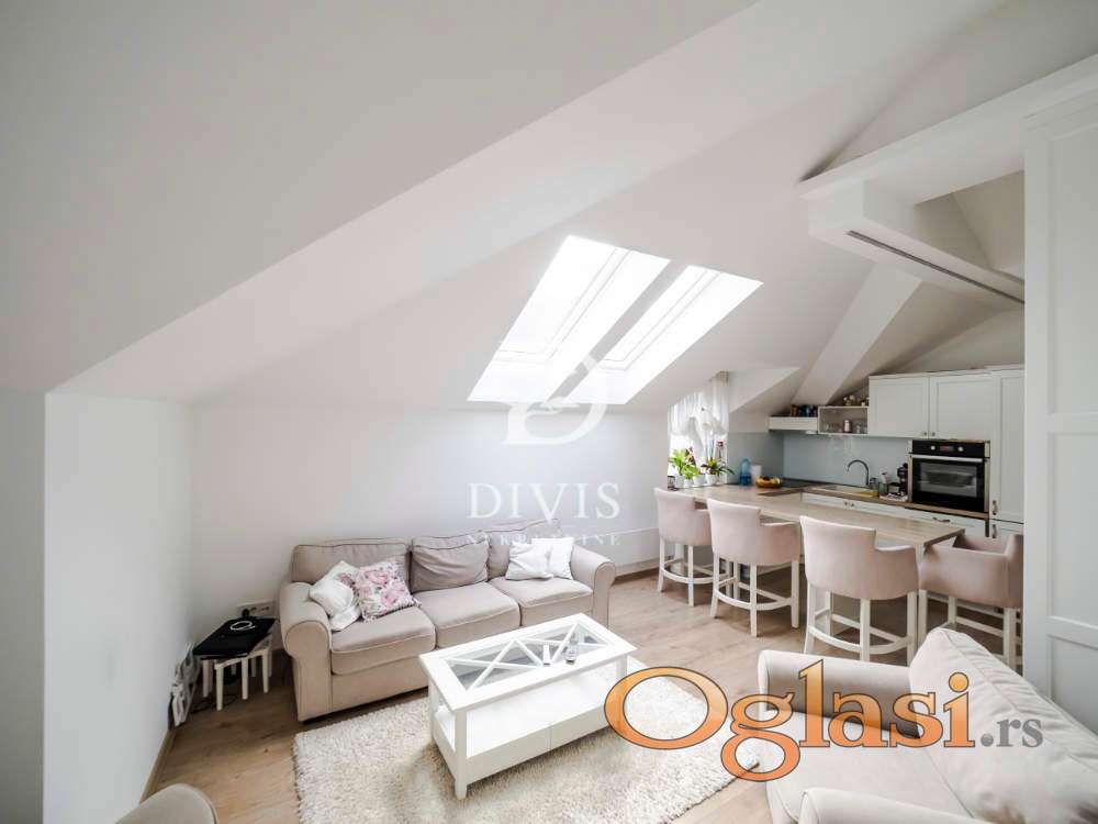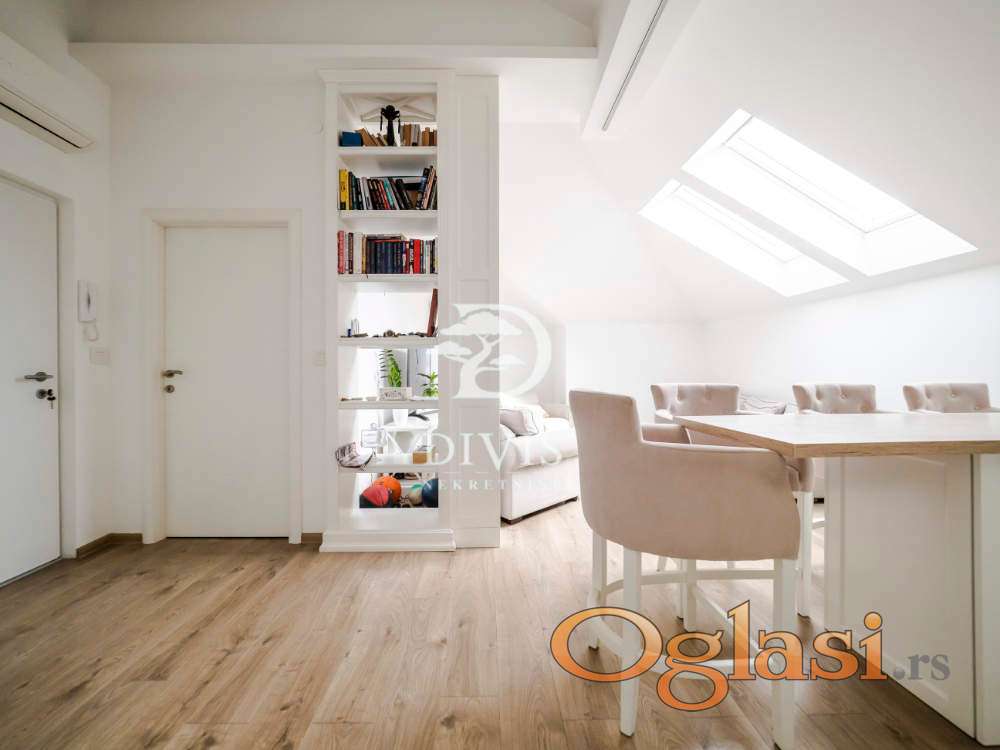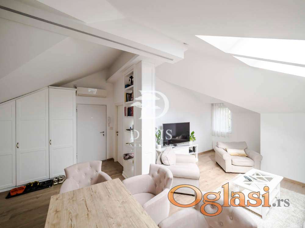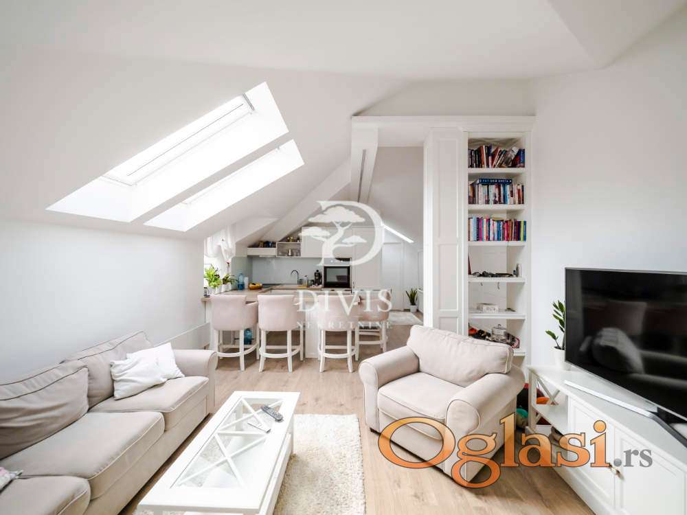 Stan se sastoji od ulaznog dela, kuhinje sa trpezarijom, dnevne sobe, kupatila i dve spavaće sobe. Stan je kompletno renoviran pre dve godine, sa potpuno novom krovnom konstrukcijom. Stan se prodaje sa ugradnom kuhinjom i svim ugradnim elementima u stanu, koji su rađeni po meri.
