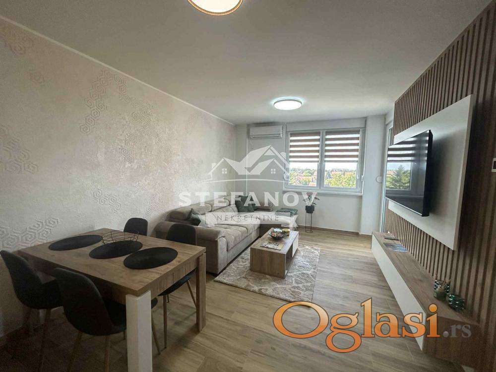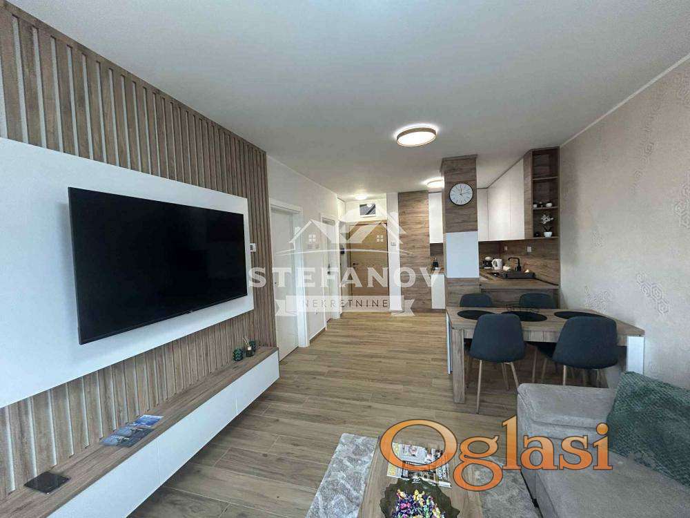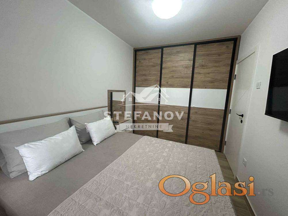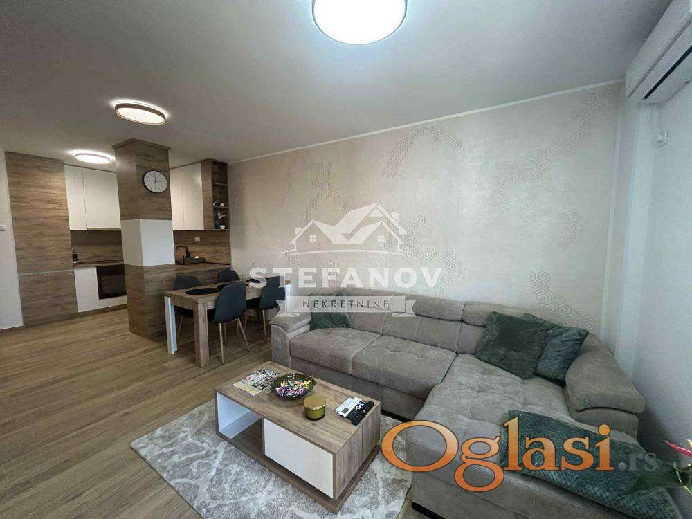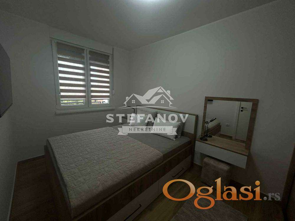 Moderno opremljen, dvosoban stan-apartman površine 45 m2 u novogradnji na idealnom III spratu zgrade sa liftom. Sastoji se od dnevnog boravka sa kuhinjom i trpezarijom, spavaće sobe, kupatila i terase. Grejanje podno na GAS, stolarija PVC sa roletnama i komarnicima (salamander stolarija). Stan izuzetno svetao, pažljivo uređen, funkcionalnog rasporeda. Kompletan nameštaj koji je rađen po meri i bela tehnika su uračunat u cenu. Registrovan kao apartman sa 4*, sa mogućnošću nastavka bavljenja iste delatnosti. Stan, kao i cela zgrada pokriveni su videonadzorom. U dvorištu zgrade nalazi se i parking mesto koje je takođe uračunato u cenu. Zgrada useljena 2025. godine i nalazi se izuzetnoj lokaciji u blizini, škola, vrtića, marketa, bolnice, pijace, TC BIG...Uknjižen 1/1
