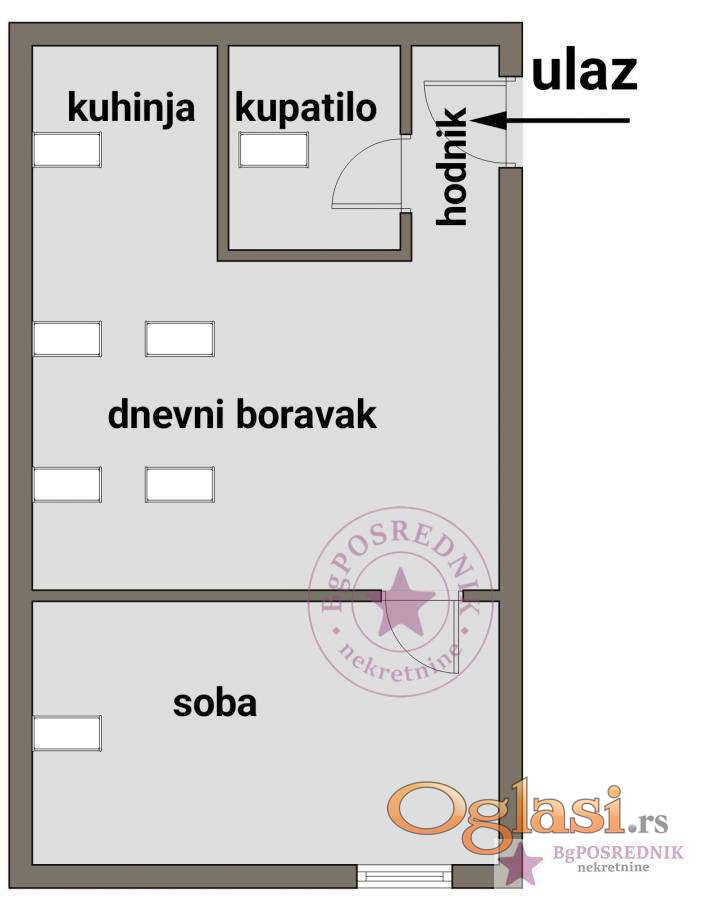 Sastoji se od ulaznog hodnika, dnevno-trpezarijskog dela, kuhinje, spavaće sobe i kupatila.