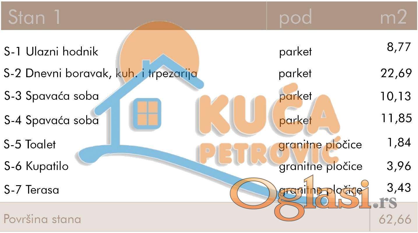Na prodaju ekskluzivna novogradnja u centru. Stambeno poslovni objekat Po+P+8. Stan je projektovane površine 62,41m2. Nalazi se na prvom spratu, čine ga ulazni hodnik, dnevna soba sa trpezarijom i kuhinjom, dve spavaće sobe, toalet, kupatilo i terasa. Svaka stambena jedinica ima nezavisan sistem grejanja i hlađenja koji je automatizovan i moguće ga je kontrolisati putem mobilnog uređaja. Sistem za grejanje je postavljen kroz pod sa elektro-kotlom, dok je rashladni sistem sa invertor klimama. Svi podovi izvedeni su kao plivajući sa ugrađenom zvučnom izolacijom. Na podu je višelojni parket, a u kupatilu granitna keramika.Unutrašnja stolarija izrađena je od visoko kvalitetnog furnira, dok je spoljna stolarija od aluminijuma. Predviđeni rok završetka je jun 2027. godine. Za kupce prvog stana postoji mogućnost povratka PDV-a. Postoji mogućnost kupovine parking mesta. Ovo je samo deo naše ponude, za više informacija stojimo Vam na raspolaganju.