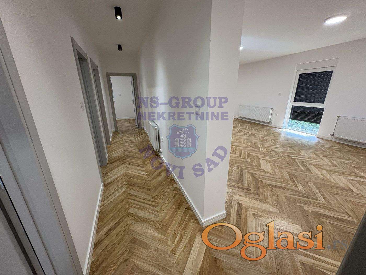 Komforan i prostran nov četvorosoban stan. Iz ulaznog hodnika sa prostorom za plakar se ulazi pravo u veliki dnevni boravak sa kuhinjom, trpezarijom i terasom, na koju se pristupa preko velikog staklenog portala. Ova dnevna zona stana ima nešto više od 50 m². Stan ima odvojenu noćnu zonu sa hodnikom iz kog se ulazi u 3 spavaće sobe, toalet i veliko kupatilo sa prirodnom ventilacijom, luksuznom španskom keramikom, svim novim sanitarijama i walk in tušem. Grejanje je na gas, stolarija je PVC sa troslojnim staklom punjenim argonom, termoizolacija je od stiropora debljine 10 cm, pod je od hrastovog parketa velikih dimenzija a ulazna vrata su visokokvalitetna i sigurnosna.U ceni stana su dva parking mesta i ostava u hodniku odmah pored stana. Objekat ima videonadzor, kao i video interfone, kapija za parking se otvara na daljinski, a objekat sa svih strana ima noćno dekorativno osveljenje. Ovom stanu pripada krovna tersa oko 100m2 sa koje se pruža predivan pogled na Frušku goru, grad, ima struju, vodu-savršena za uživanje. Ublizini Gradski prevoz,Osnovna škola,vrtić,pošta,marketi,taxi stajalište, itd. Savršen porodičan stan koji vredi videti. Po isplati odmah useljiv. Naša preporuka. Pozovite.064/1494114