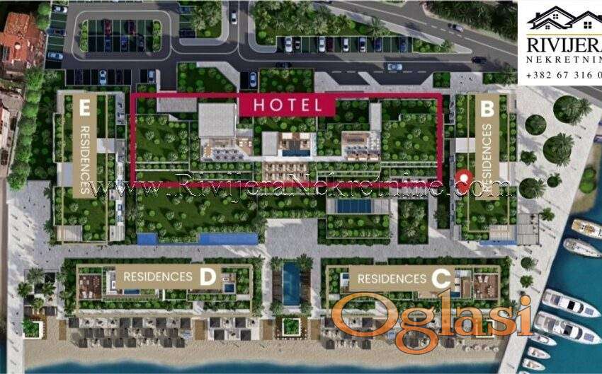 Kolekcija od šezdeset šest prostranih apartmanskih rezidencija u slobodnom vlasništvu na prvoj liniji do mora u 1-, 2- i 3-sobnoj konfiguraciji, idilično smještenih na pješčanim obalama svjetski poznatog Bokokotorskog zaliva pod zaštitom UNESCO-a.