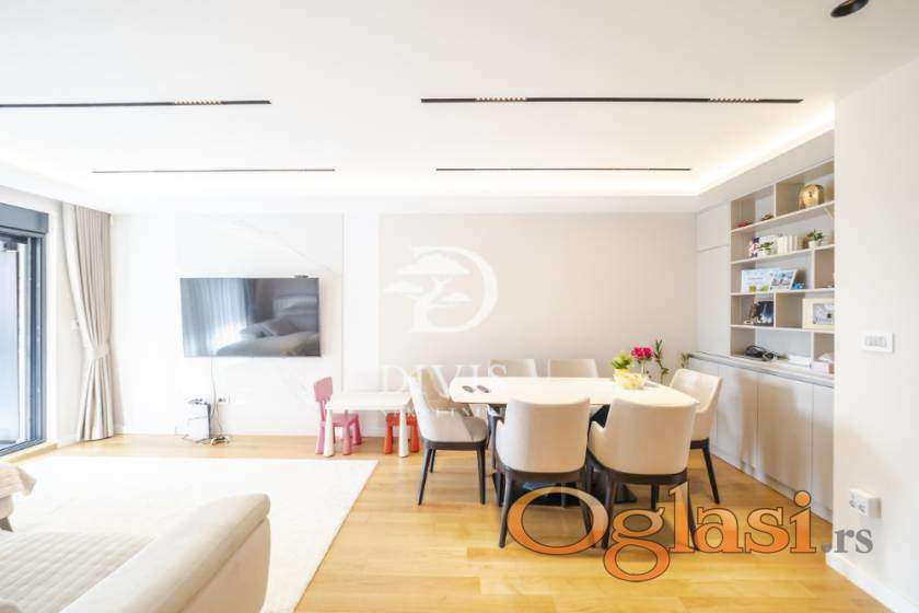 Stan se sastoji od ulaznog hodnika, prostrana dnevna soba sa trpezarijom i kuhinjom, spavaće sobe, dečije sobe, kupatila i velike terase. Izdvaja se odličnim rasporedom prostorija, obiljem prirodnog svetla i modernim enterijerom. Kompletno je namešten i opremljen kvalitetnim materijalima i tehnikom.