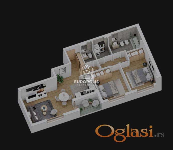 Ovaj stan predstavlja spoj savremenog dizajna, najkvalitetnijih materijala i napredne tehnologije. Prozori velikog formata obezbeđuju obilje prirodne svetlosti, dok Smart Home sistem omogućava potpunu kontrolu doma – putem mobilne aplikacije, na dodir vašeg prsta.