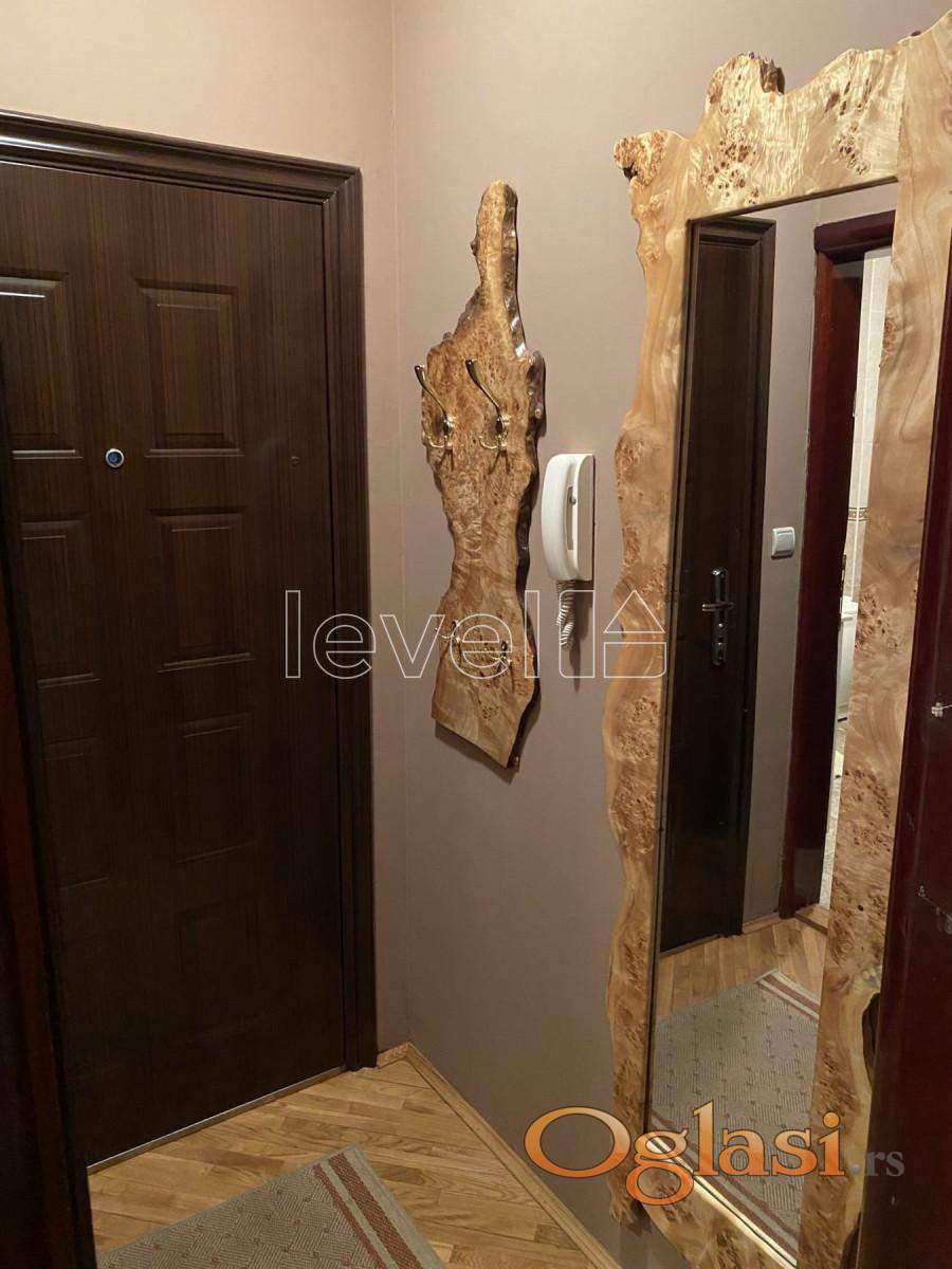 Stan je kompaktan, pravilnog oblika, što omogućava lako opremanje i organizaciju prostora. Kuhinja je uvučena, funkcionalna i poseduje sve neophodne elemente, fizički odvojena od dnevne zone šank-pultom od punog drveta. Sav nameštaj je ulljučen u cenu.