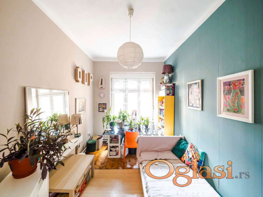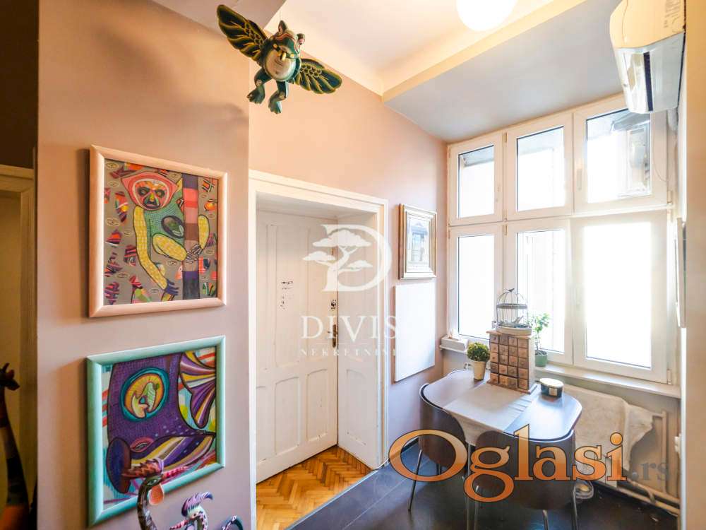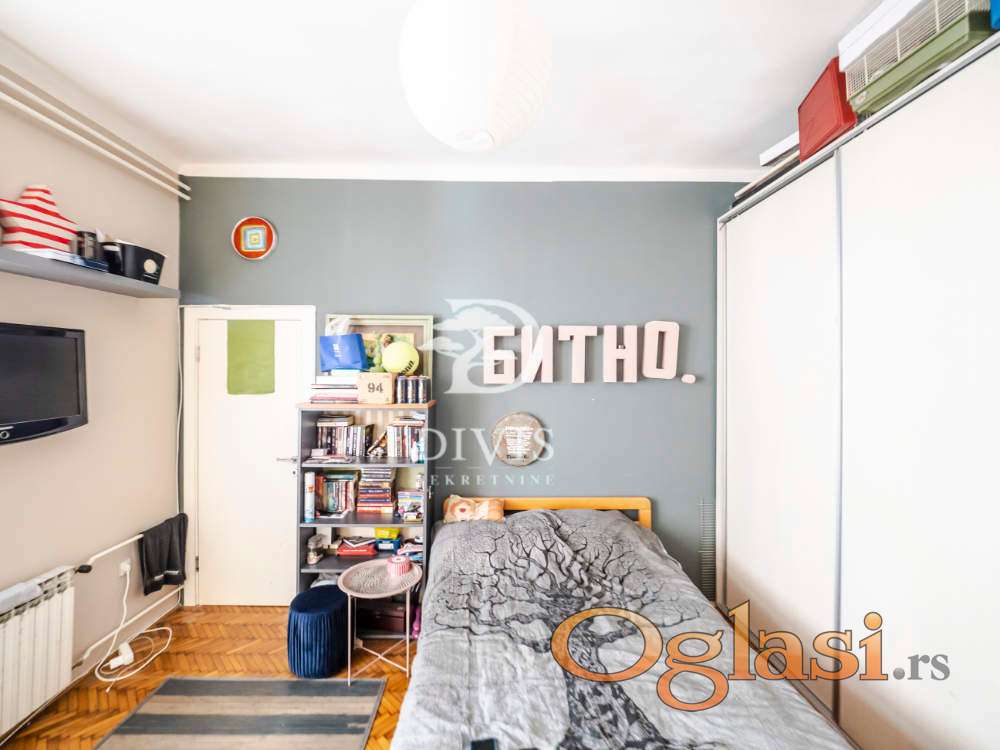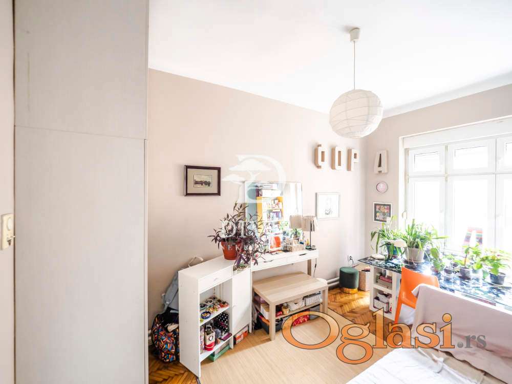 Raspored prostorija je idealan za porodični život — ulazni hodnik vodi u prostranu dnevnu sobu, tri svetle i komforne spavaće sobe, dva kupatila i terasu sa prijatnim pogledom. Visoki plafoni i veliki prozori obezbeđuju obilje dnevne svetlosti i ističu autentičan salonski karakter prostora. Uz stan ide i pripadajuća podrumska prostorija.