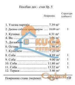 Na prodaju troiposoban stan u useljivom, novoizgrađenom stambeno-poslovnom kompleksu Po+P+6, u blizini Apelacionog suda, projektovane površine 98 m2. Sastoji se od ulaznog hodnika, dnevnog boravka sa trpezarijom, odvojene kuhinje, ostave, toaleta i spavaćeg degažmana koji čine četiri spavaće sobe, kupatilo i terasa. Stan se nalazi na lokaciji pogodnoj kako za život tako i za izdavanje zbog blizine svih infrastrukturnih objekata. Stolarija aluminijumska, troslojno staklo sa termoprekidom i alu roletnama sa elektromotornim pogonom, klizna balkonska vrata. Objekat je građen termo blokom. Spoljašnja izolacija je kamena vuna 12cm, na podovima je višeslojni tarket parket, u kupatilu i kuhinji je španska keramika. Sanitarija je Geberit sa konzolnom wc šoljom, ugradnim vodokotlićima, tuš kabina sa kanalnicama.. Grejanje je centralno, na gas, a u svakom stanu instalirana je po jedna inverter klima u dnevnom boravku. Lift je bešumni i kreće iz -2 nivoa. Zgrada poseduje podzemne garaže na dva nivoa i parking mesta na platou koji se zasebno prodaju. Za kupce prvog stana postoji povrat PDV-a. Ovo je samo deo naše ponude, za više informacija, stojimo vam na raspolaganju.
