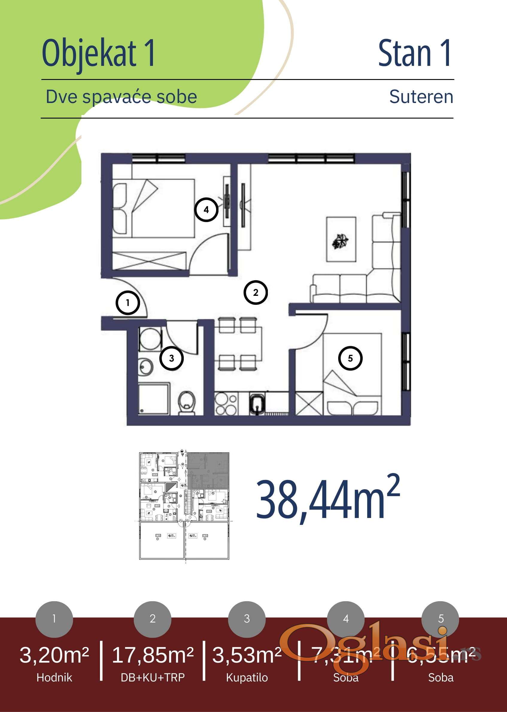 Iz ponude izdvajamo dvosoban površine 38,44m2 koji se nalazi u suterenu.
