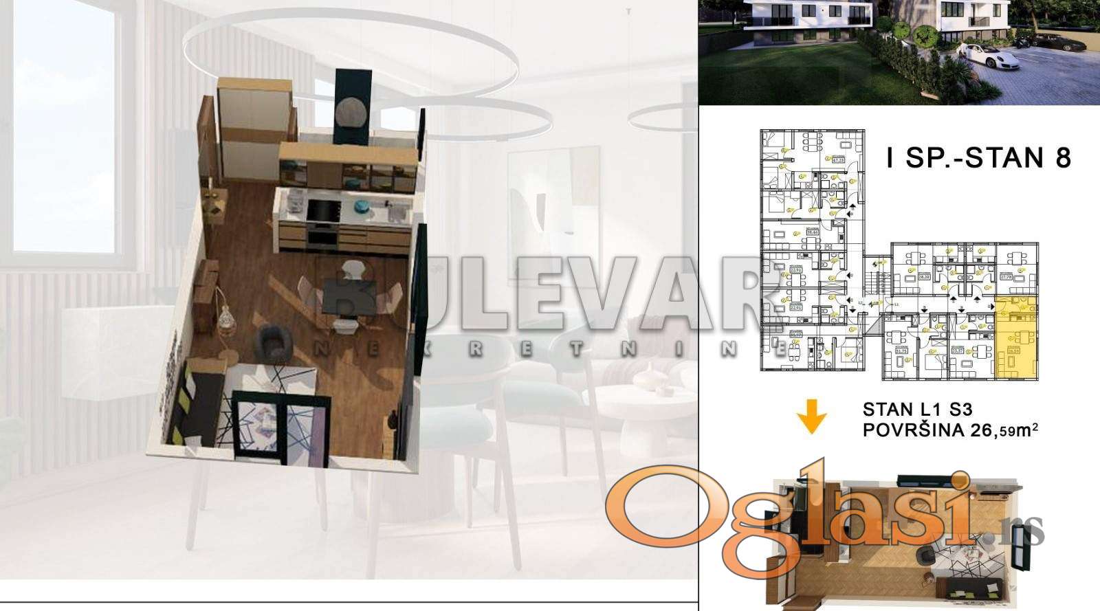 Na prodaju garsonjera u izgradnji. Stambeni kompleks smešten u mirnom delu Vrnjačke Banje, u neposrednoj blizini akva parka, na svega nekoliko minuta hoda od centralnog parka i svih bitnih sadržaja koji pružaju kvalitetan i miran odmor. Okružen zelenilom, izdvojen od gužve, pruža jedinstven mir i tišinu. Zgrada je izgrađena od najkvalitetnijih materijala, poseduje lift, interfon, kamere, ALU stolarija i roletne, na podovima je višeslojni hrastov parket prve klase, u kupatilu, kuhinji i na terasi granitna keramika, sanitarija renomiranih proizvodjača, inverter klima uredjaj. Stan je po strukturi garsonjera, površine 26 m2 a njegovu strukturu čine hodnik, dnevni boravak sa kuhinjom i trpezarijom, kupatilo i terasa. Za sve informacije i razgledanje stojimo vam na raspolaganju, radnim danima od 09-19h i subotom od 09-17h. Ovu i druge nekretnine sa većim brojem fotografija možete pogledati na našem sajtu: bulevarnekretnine.rs, kontakt: info@bulevarnekretnine.rs, usluga besplatna. Čekamo Vas. Telefon 034/330808 i 060/0544253. Bulevar Nekretnine 034, Kragujevac, broj u registru posrednika: 1278.
