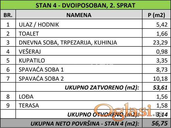 Ukupna površina stana 56,75m2 sa terasom (1,58m2) i lođom (1,56m2), grejne površine 53,61m2.