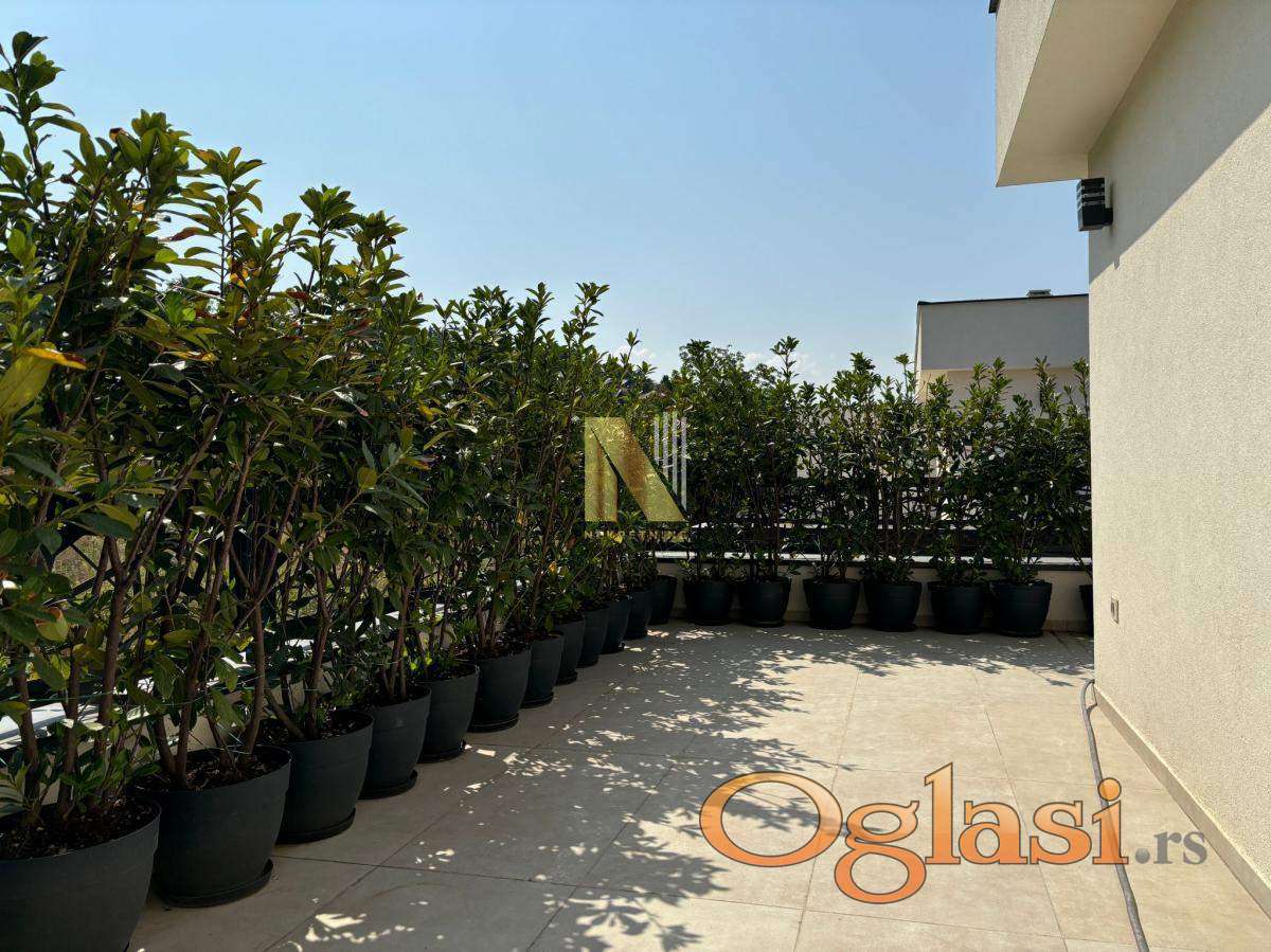 Sastoji se od prostrane trpezarije sa kuhinjom, tri spavaće sobe od koje je jedna pretvorena u walk in closet, dnevnog boravka sa bibliotekom, tri kupatila u kom svaki ima tuš kabinu, dvorišta sa dva parking mesta.