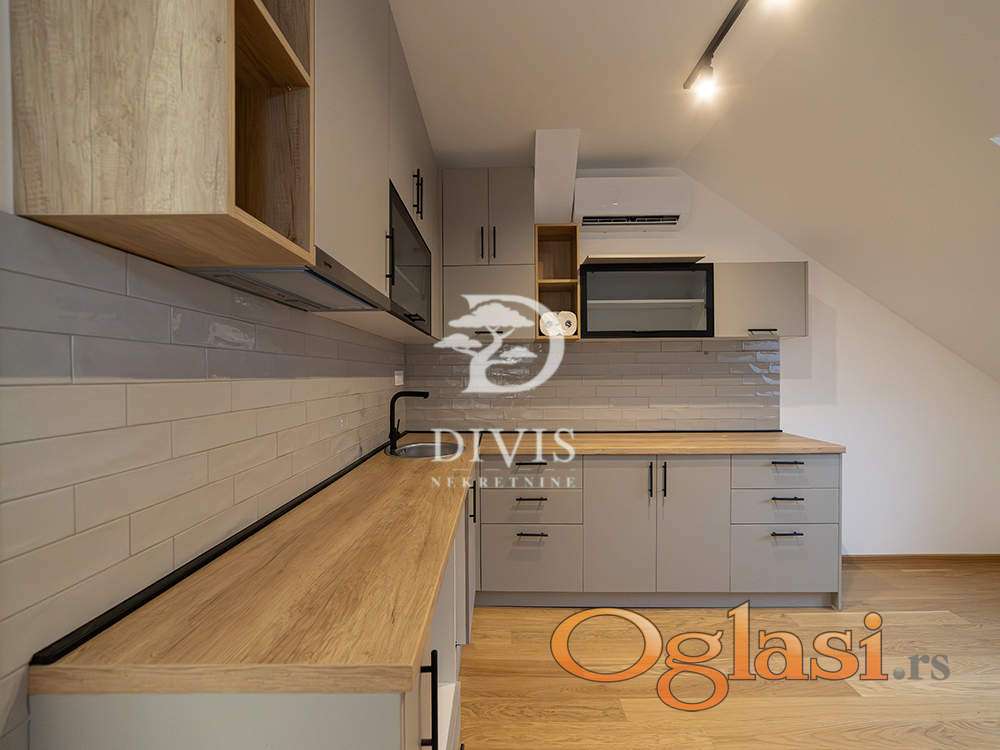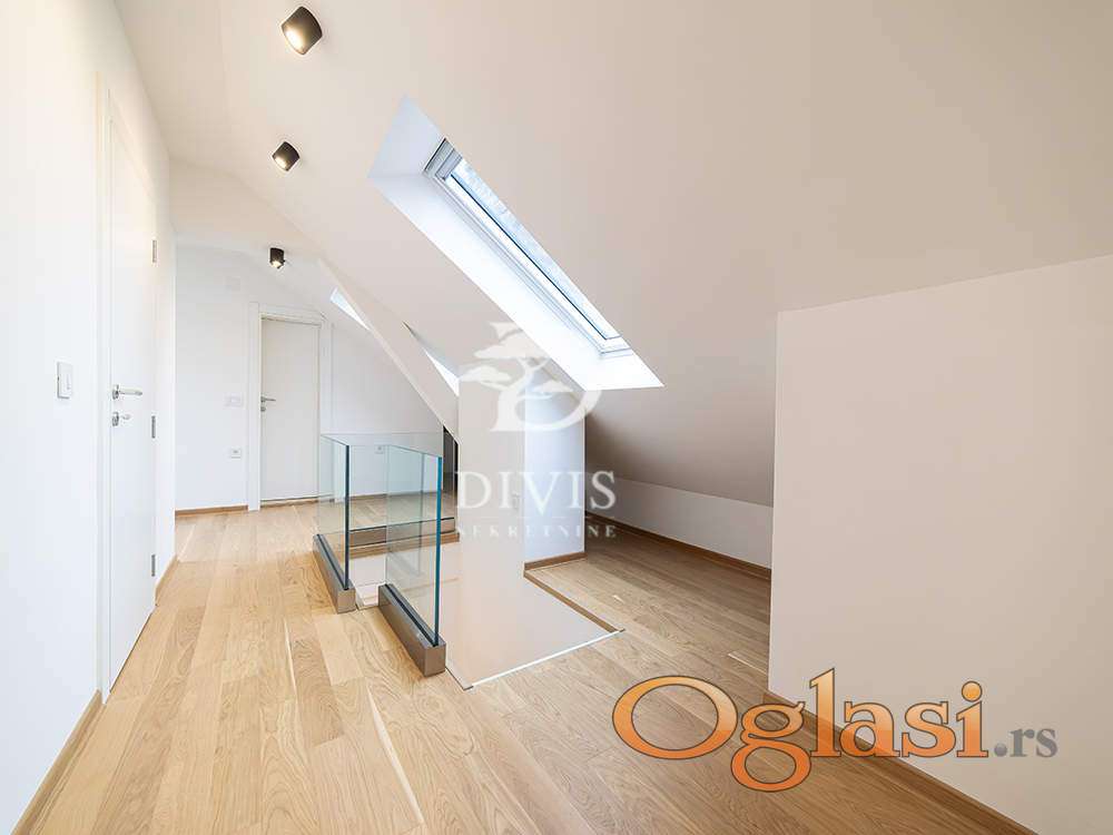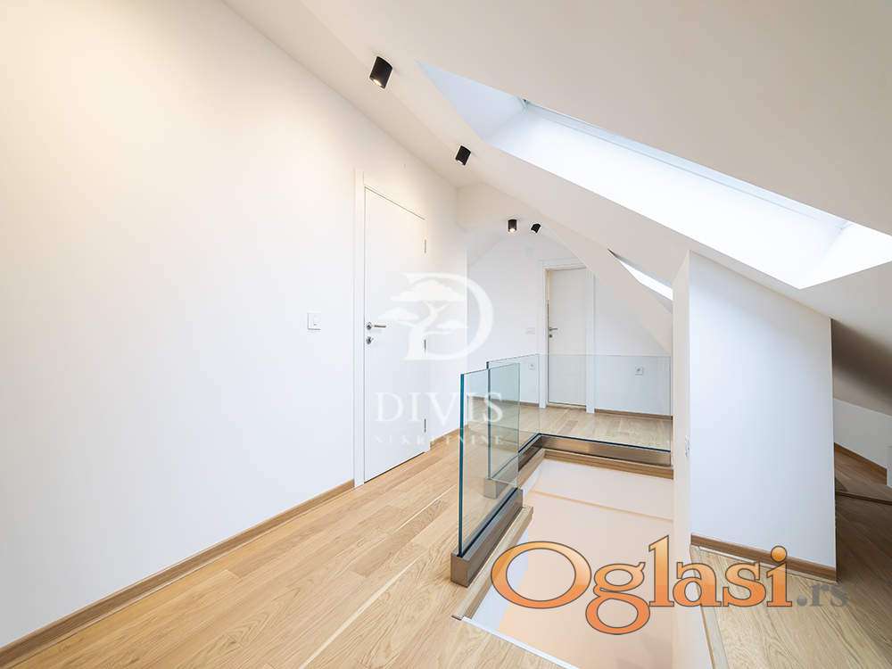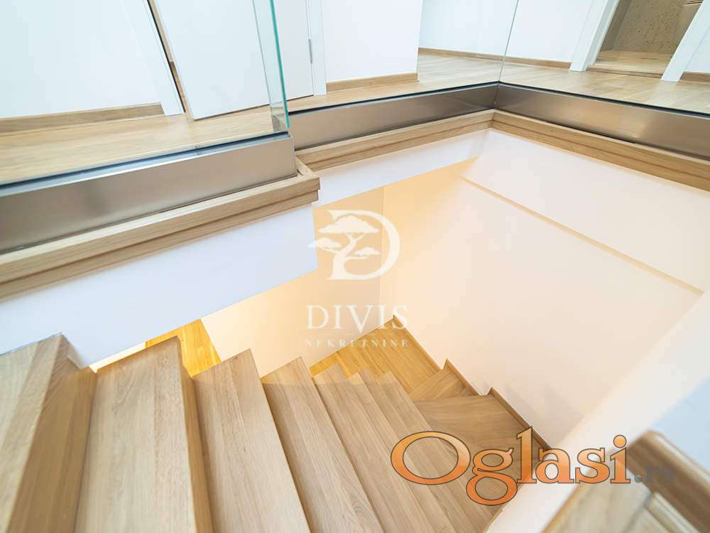 U jednoj celini nalazi se manja soba, dnevni boravak sa trpezarijom, kupatilo i prostor predviđen za kuhinju (koja je već kupljena i uključena u cenu stana). U drugom delu stana, na donjoj etaži, nalaze se hodnik, kupatilo, garderober, velika kuhinja sa trpezarijom i prostran dnevni boravak. Iz hodnika vode stepenice na gornji nivo gde se nalaze dve spavaće sobe (jedna manja i jedna veća ) kao i dodatno kupatilo.