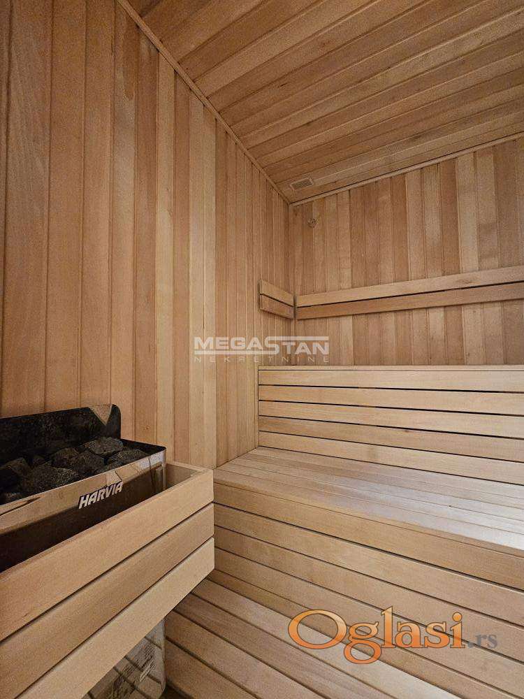 Dve spavaće sobe, dva toaleta, dnevno trpezarijski deo, kuhinja. Iz svih soba izlazi se na veliku terasu od 90m2.