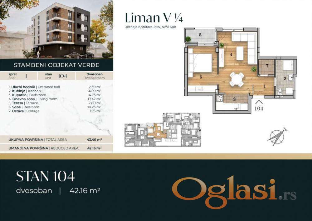 Na jednoj od najtraženijih lokacija u Novom Sadu, u novoizgrađenom objektu Verde, nudimo vam savršeno organizovan dvosoban stan na I spratu. Zgradu gradi jedan od najrenomiranijih i najpouzdanijih investitora, poznat po vrhunskom kvalitetu gradnje, pažljivom odabiru materijala i izuzetno modernom pristupu arhitekturi.