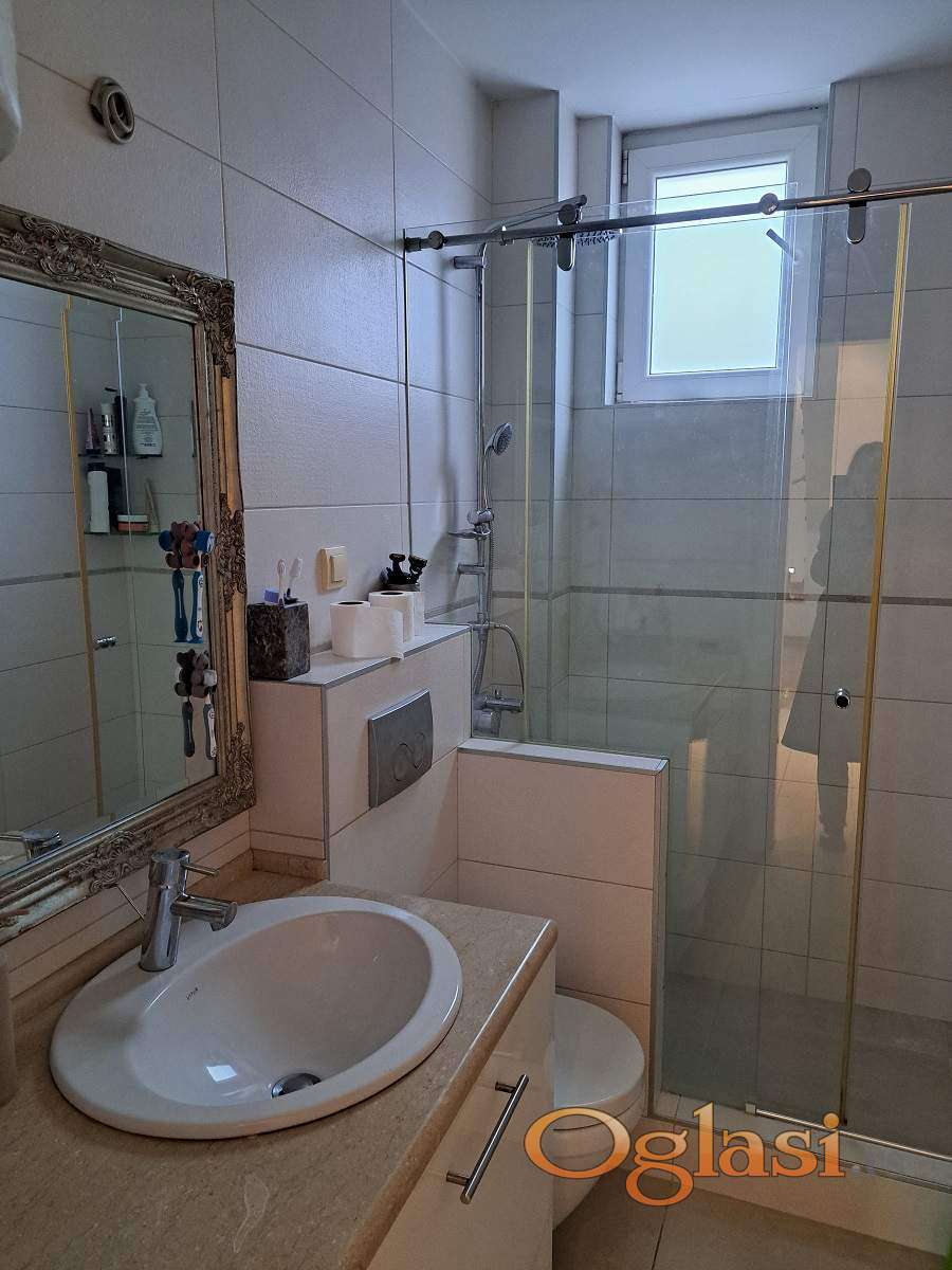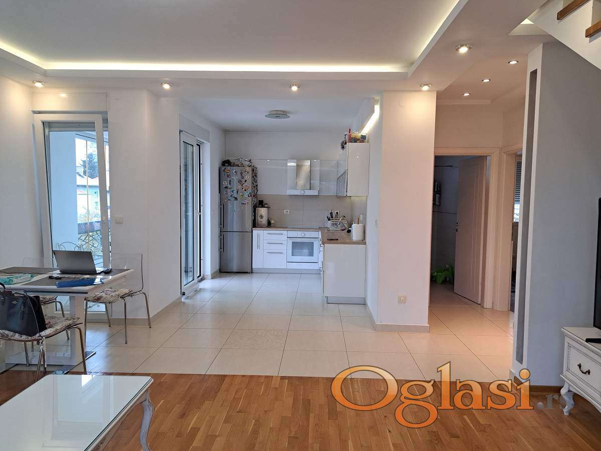 Raspored: ulazni deo, kuhinja sa trpezarijom, dnevna soba, spavaća soba, kupatilo i terasa. Na drugom nivou nalaze se još dve spavaće sobe, hodnik i dodatno kupatilo. Stan je u odličnom stanju i ne zahteva dodatna ulaganja. Troškovi su niski, grejanje je na toplotnu pumpu. Prodaje se sa ugradnom kuhinjom i svim ugradnim elementima.
